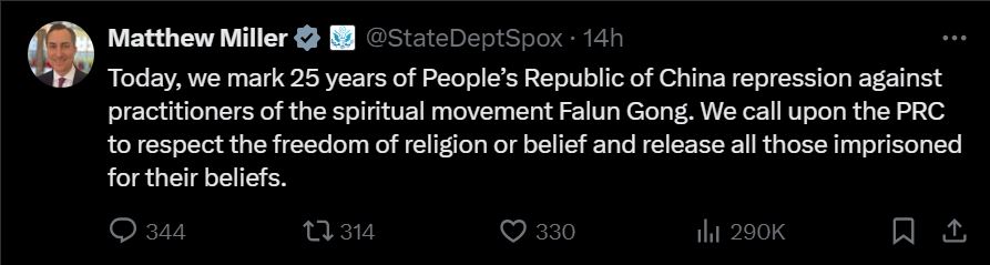 七月二十日,美国国务院发言人马修•米勒(Matthew Miller)在推特上发表声明。声明中说,“今天,我们哀悼中共迫害法轮功修炼者二十五周年。我们呼吁中共尊重宗教和信仰自由,释放所有因信仰而被监禁的人。”