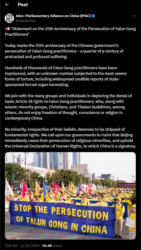 七月二十日,对华政策跨国议会联盟(Inter-Parliamentary Alliance on China,IPAC)也在推特上发表声明,谴责中共迫害法轮功。