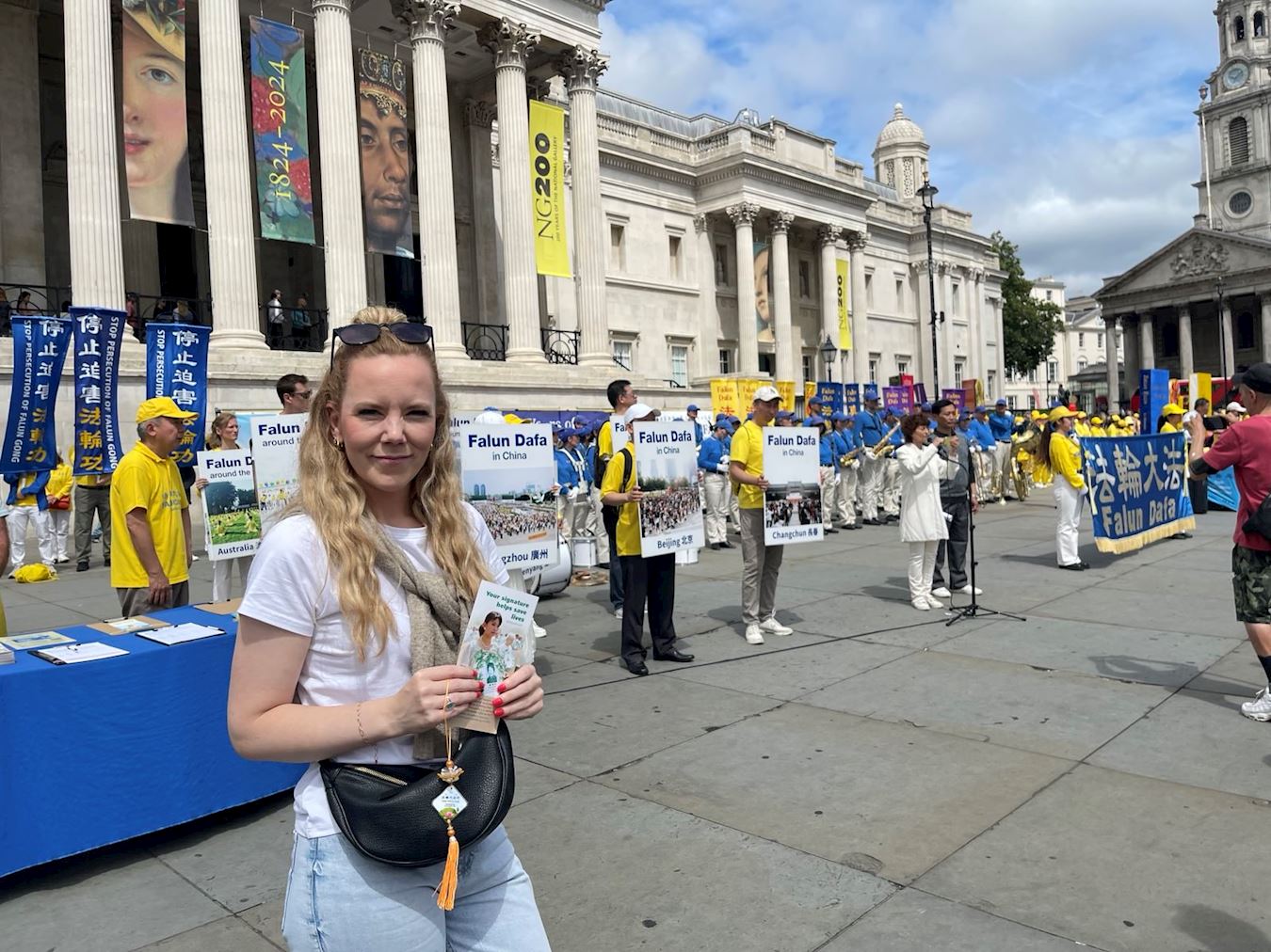 露易丝(Louise)来自丹麦,在一家咨询公司负责招聘工作,她表示自己被传单上的信息震惊了,她说:“尽管我生活在一个信息非常发达的国家,但我以前从未听说过这件事。所以我相当震惊。”她表示,真善忍是每个人都应该遵循的原则,她说:“我觉得每个人都应该按照这些原则生活。仅仅因为有人按照这些原则生活,他们的器官就被活摘,想想就觉得可怕。”