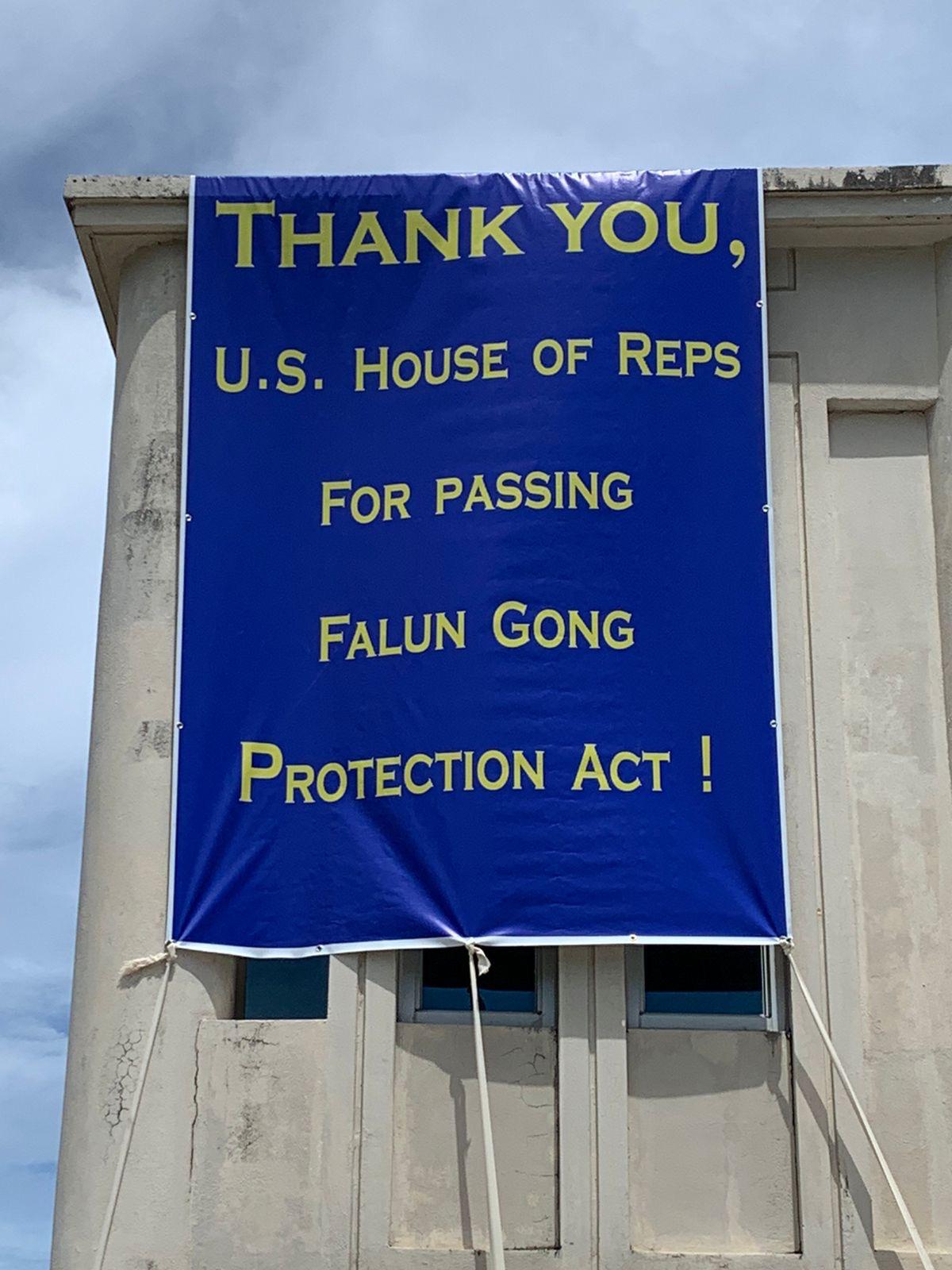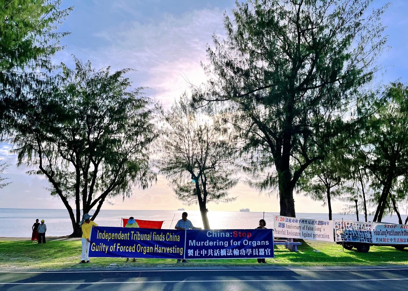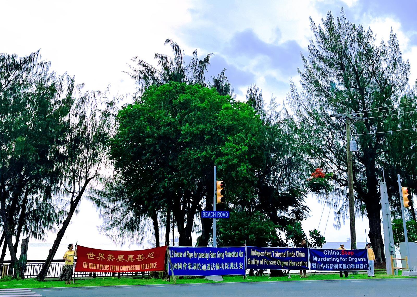 法轮功学员们祥和友善地静立在海滨路旁拉横幅,横幅内容有:美国众议院通过《法轮功保护法案》;共同制止中共活摘法轮功学员器官;独立法庭认定中共活摘器官罪行;法轮功和平理性反迫害25周年;法轮大法好;世界需要真善忍等横幅。现场平和、友善和理性的气氛,感染路人,有的车辆默默驶过观看横幅内容;有的来往车辆不断鸣喇叭表示支持大法;有的司机打开车窗向学员们打招呼致意;有的高呼“法轮大法好,Falun Dafa is good”!