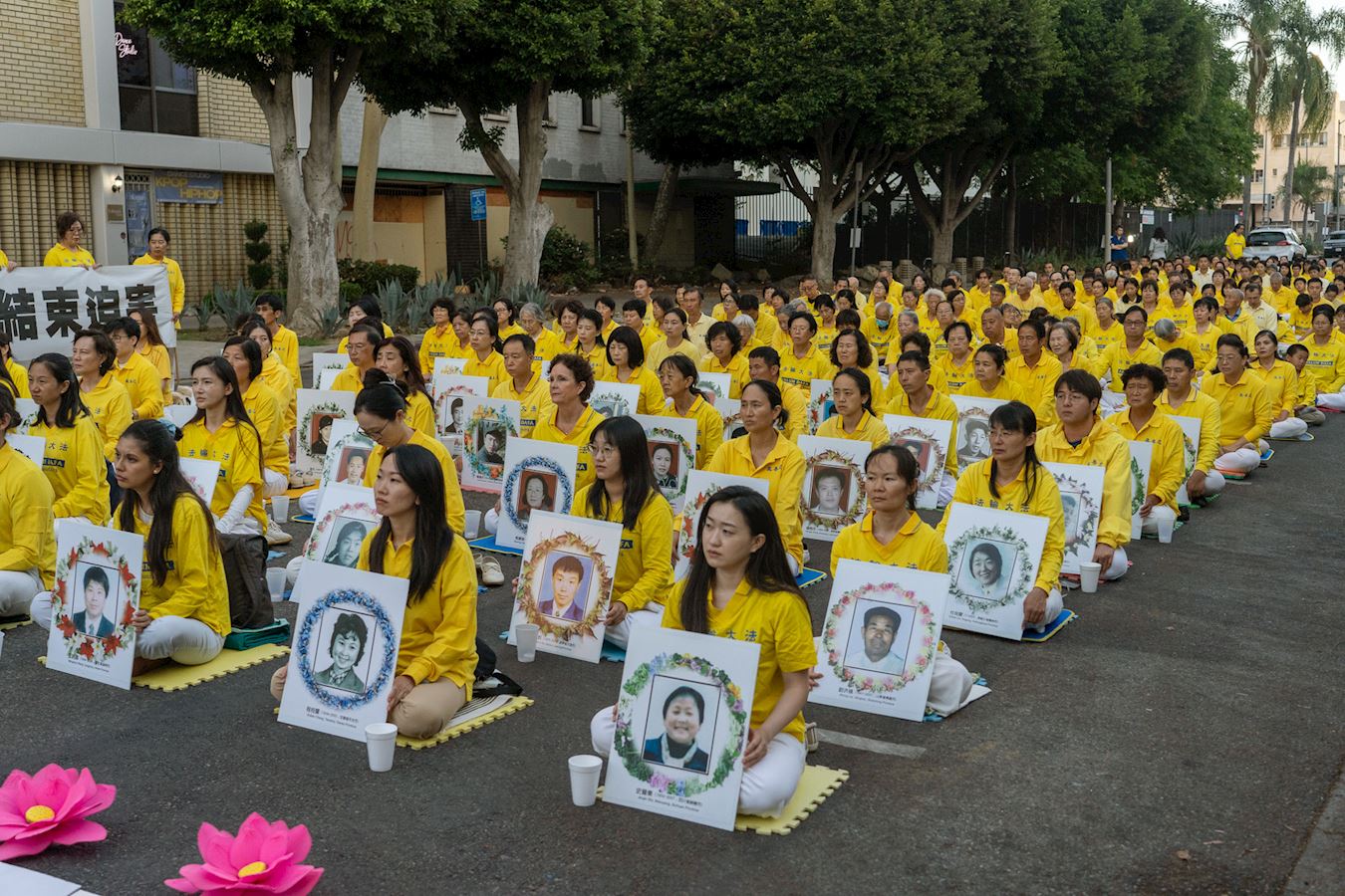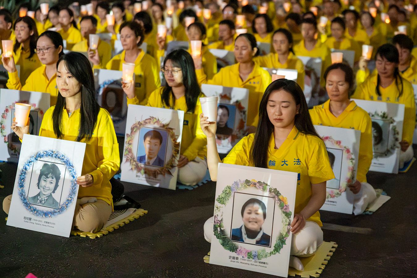 当晚,身穿黄色服装的法轮功学员静静地盘坐在中领馆门前。他们举起烛光,手扶被中共迫害致死的法轮功学员遗像,在悲壮肃穆的乐声中,悼念为维护真、善、忍信仰而失去生命的法轮功学员。