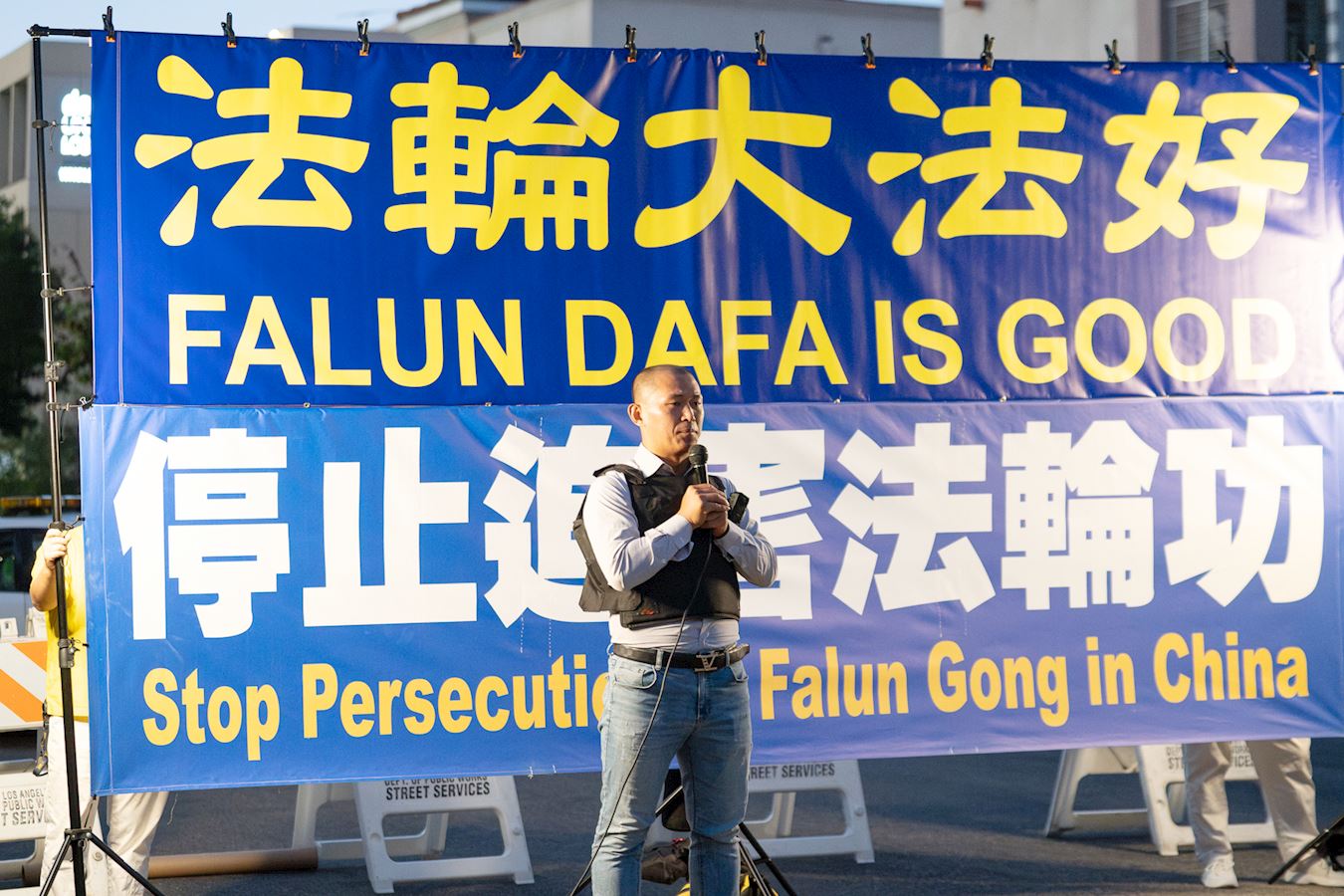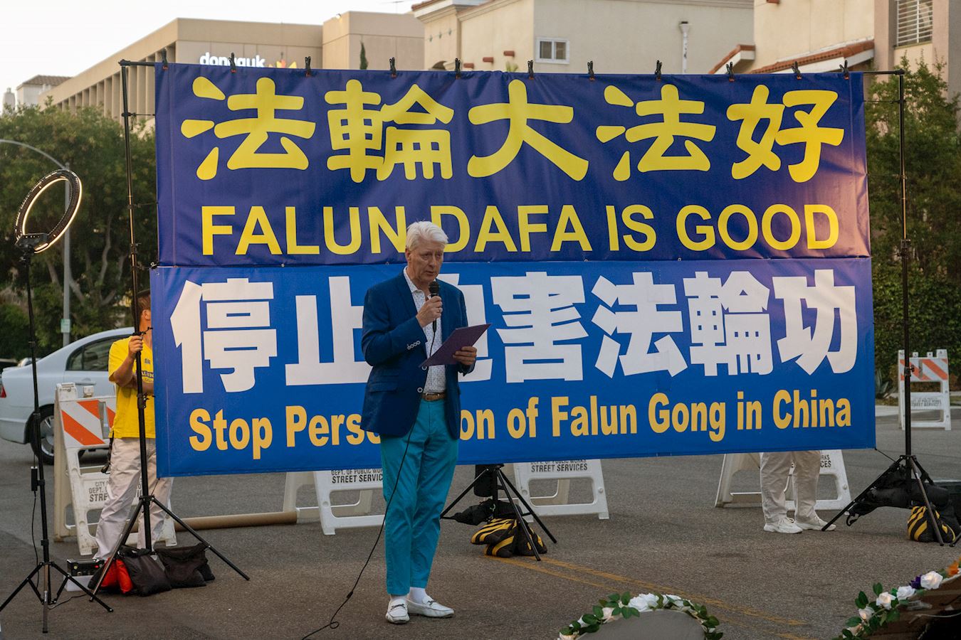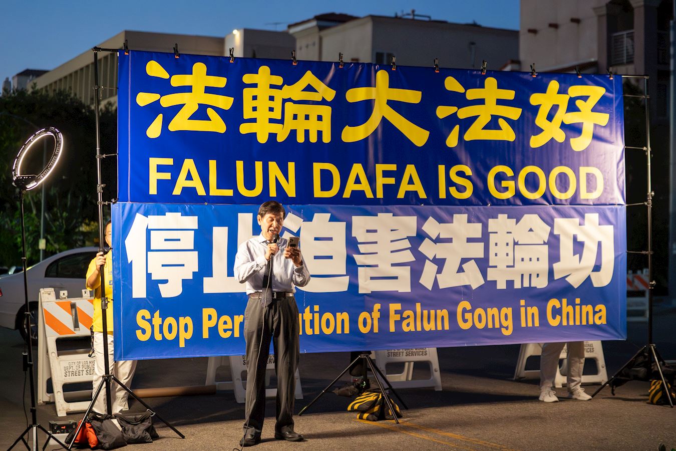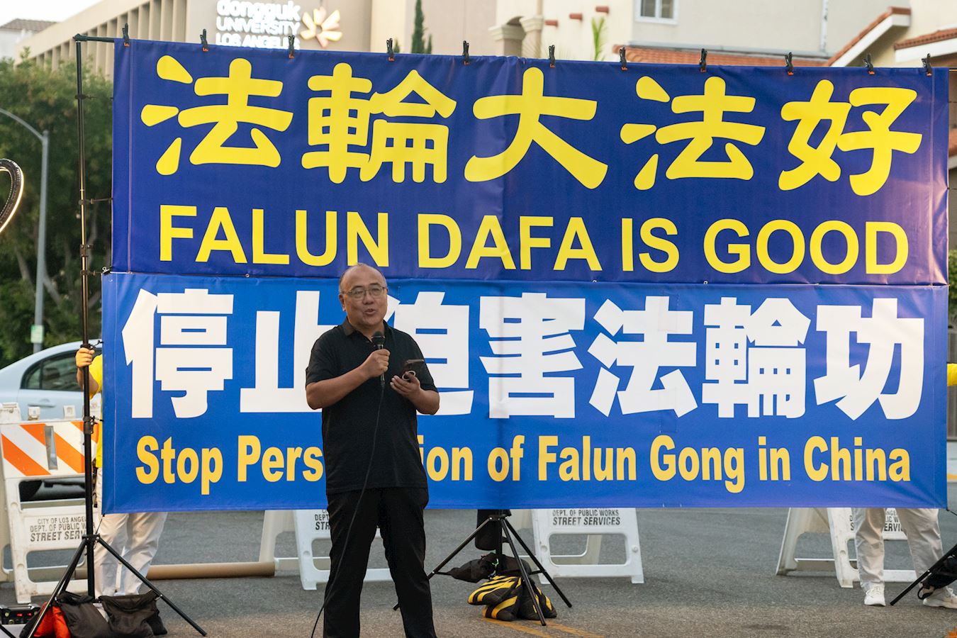 洛杉矶法轮大法修炼团体发言人吴英年教授发言中说:“今天我们在中共驻洛杉矶领馆前,谴责中共对法轮功学员长达二十五年的残酷迫害,呼吁国际社会关注这一严重侵犯人权的行为。”
