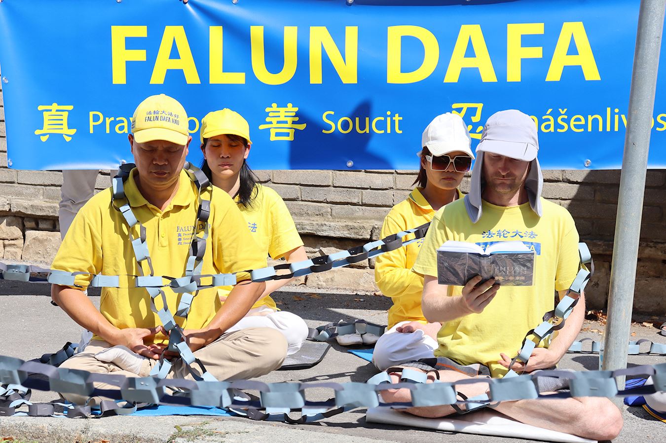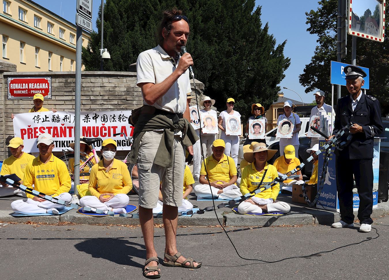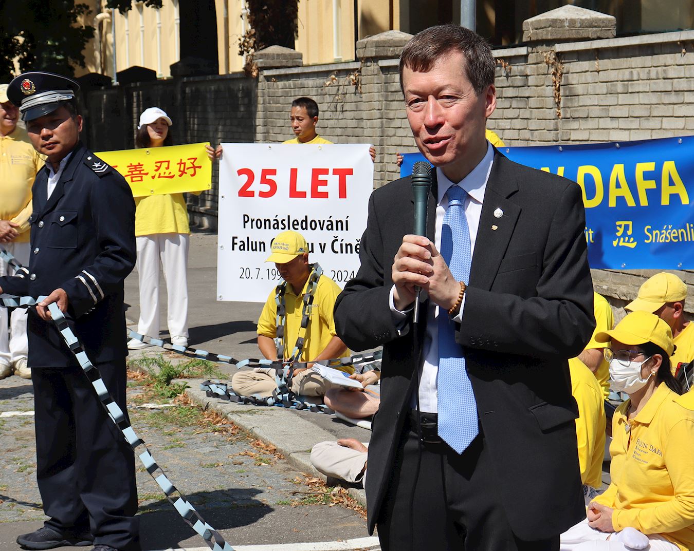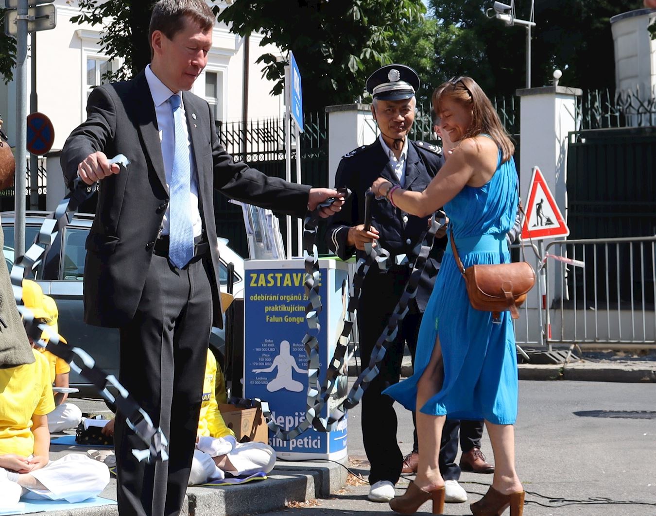 国会议员冈村隼人(MP Hayato Okamura)与演员安德里亚·塞尔纳(Andrea Cerna)、戴维·施泰格瓦尔德(David Steigerwald)来到活动现场表示支持,他们在中共驻布拉格大使馆前打破了一条困住学员、二十五米长的纸链,纸链象征法轮功学员所遭受的长达二十五年的迫害。