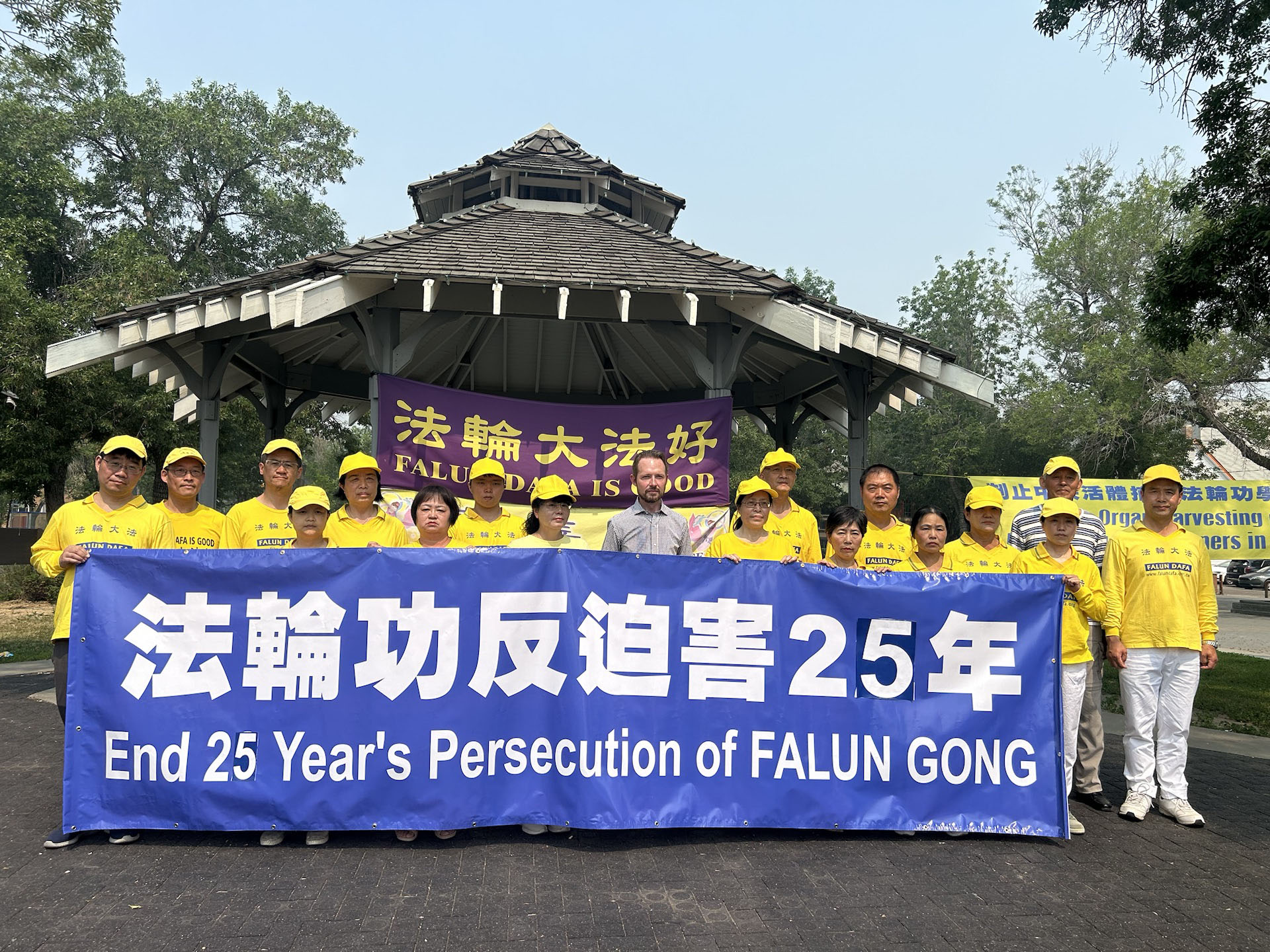 ![]() 图1:二零二四年七月二十日,埃德蒙顿部份法轮功学员与国会议员(中)一起,集会纪念法轮功反迫害25周年。 |