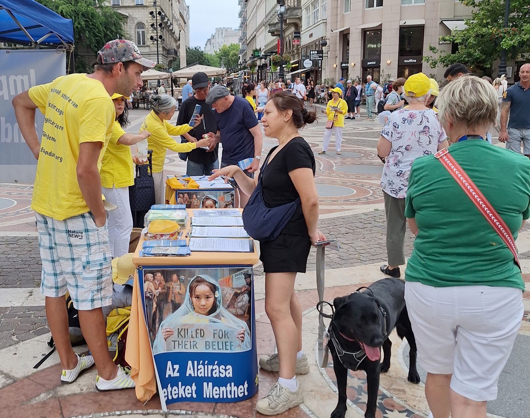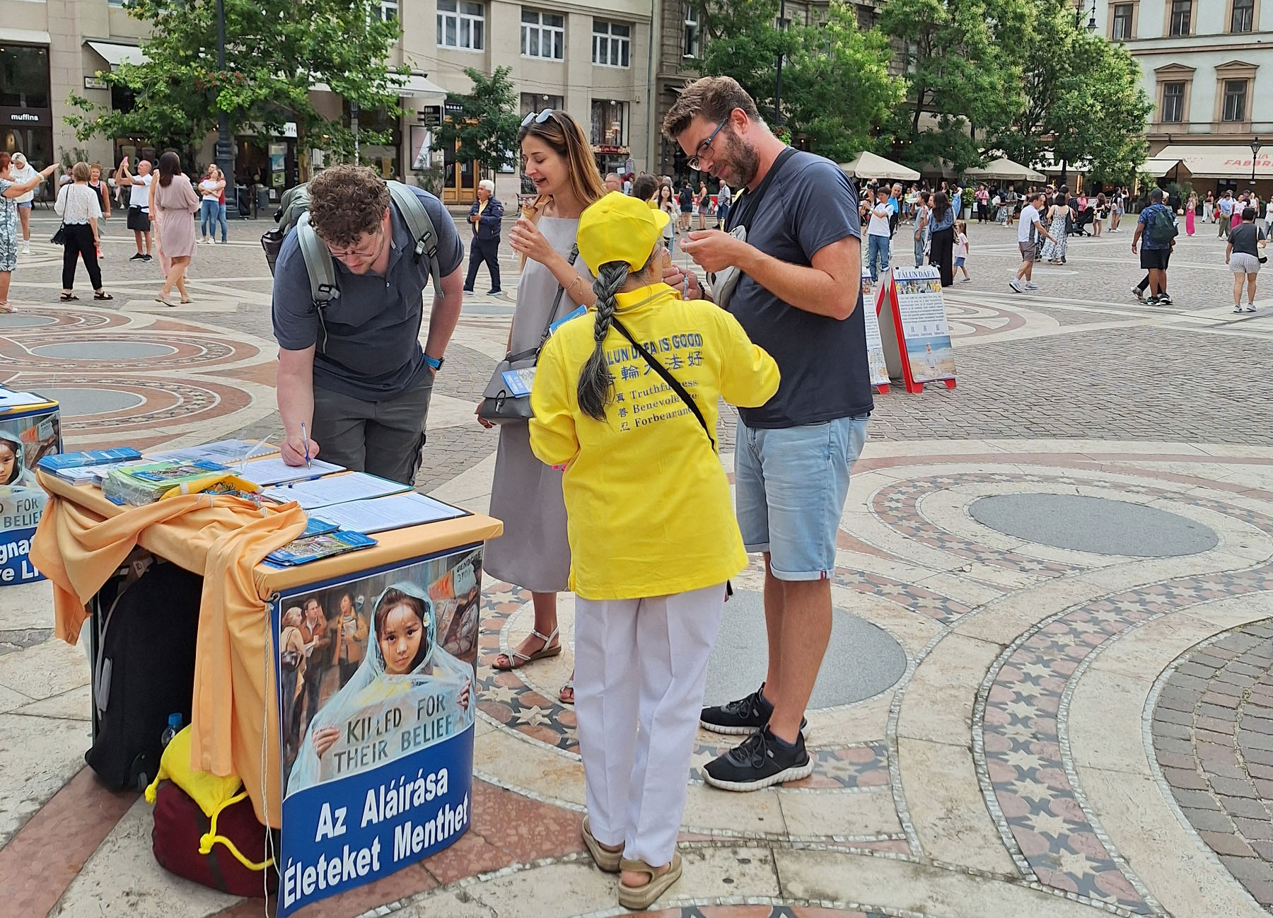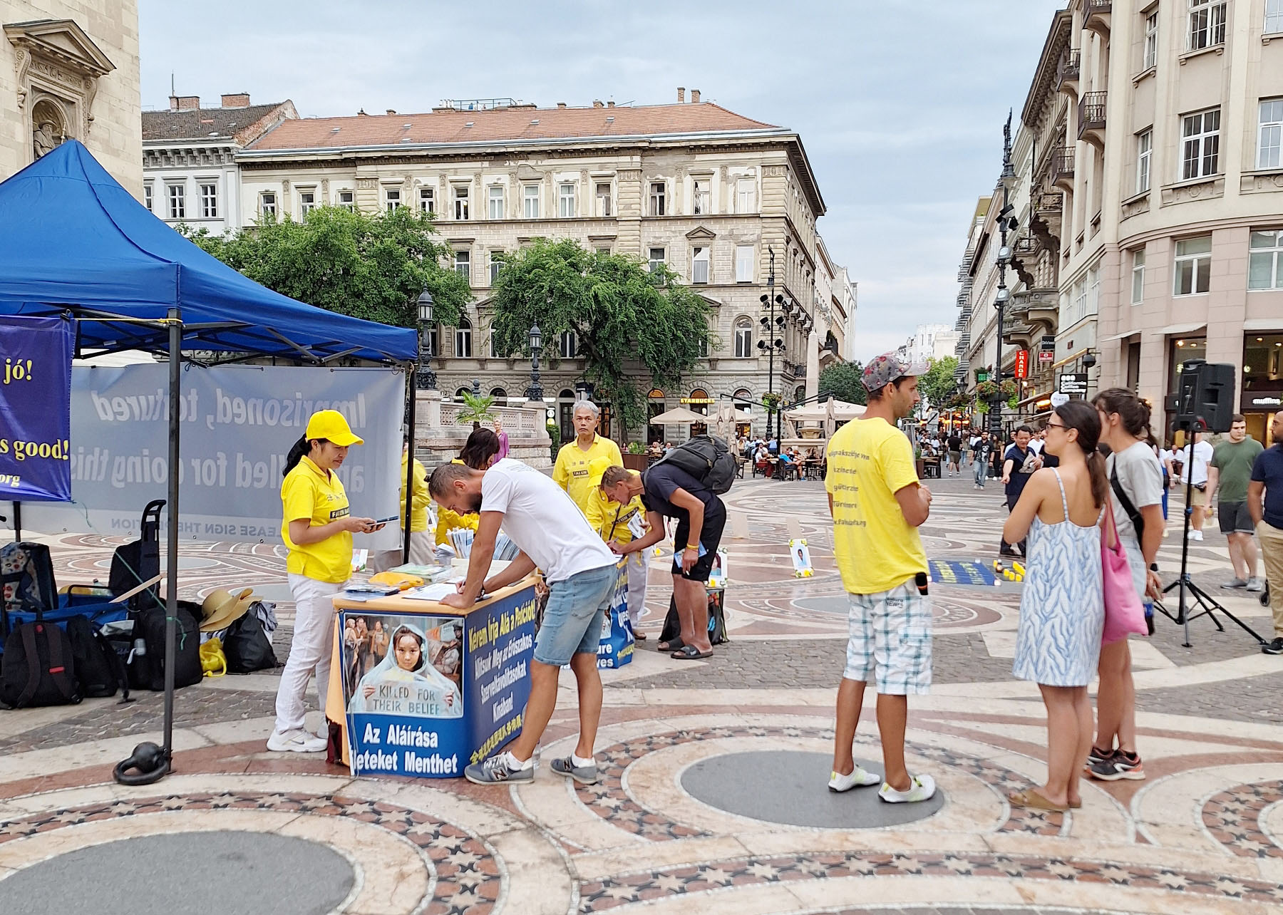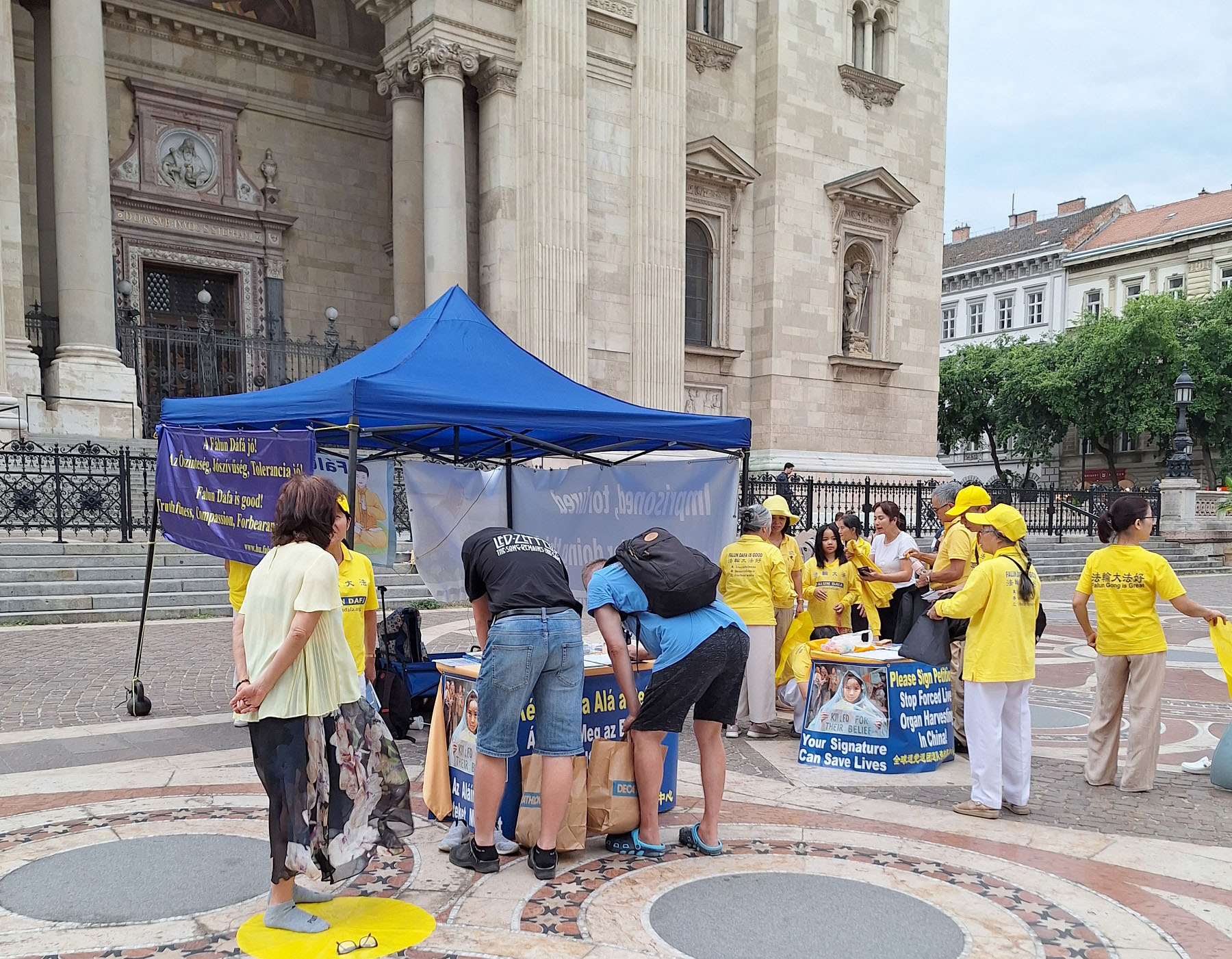 每逢周末,法轮功学员会在布达佩斯人们喜爱的重要建筑之一——圣斯蒂芬大教堂前设立了信息台。众多国外和当地游客都会来参观这座位于首都中心的教堂。法轮功信息台前经常有许多市民及游客驻足观看,有的拍照,有的想了解更多关于法轮功的讯息,有的想学炼功法,成了當地一道真相風景線。