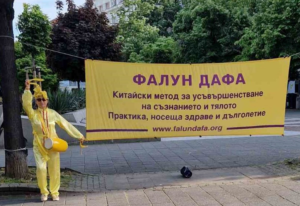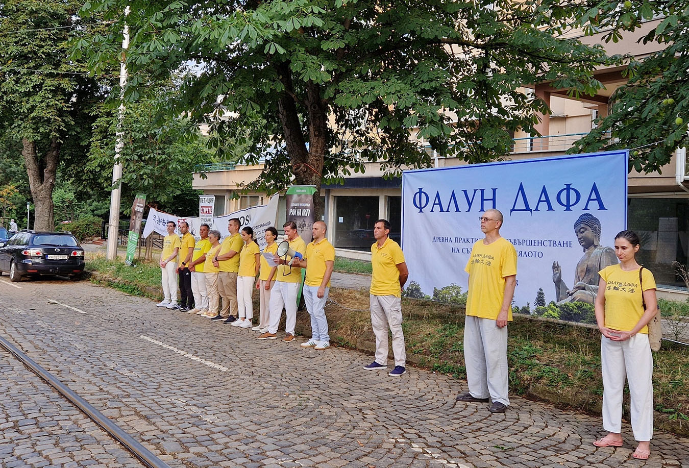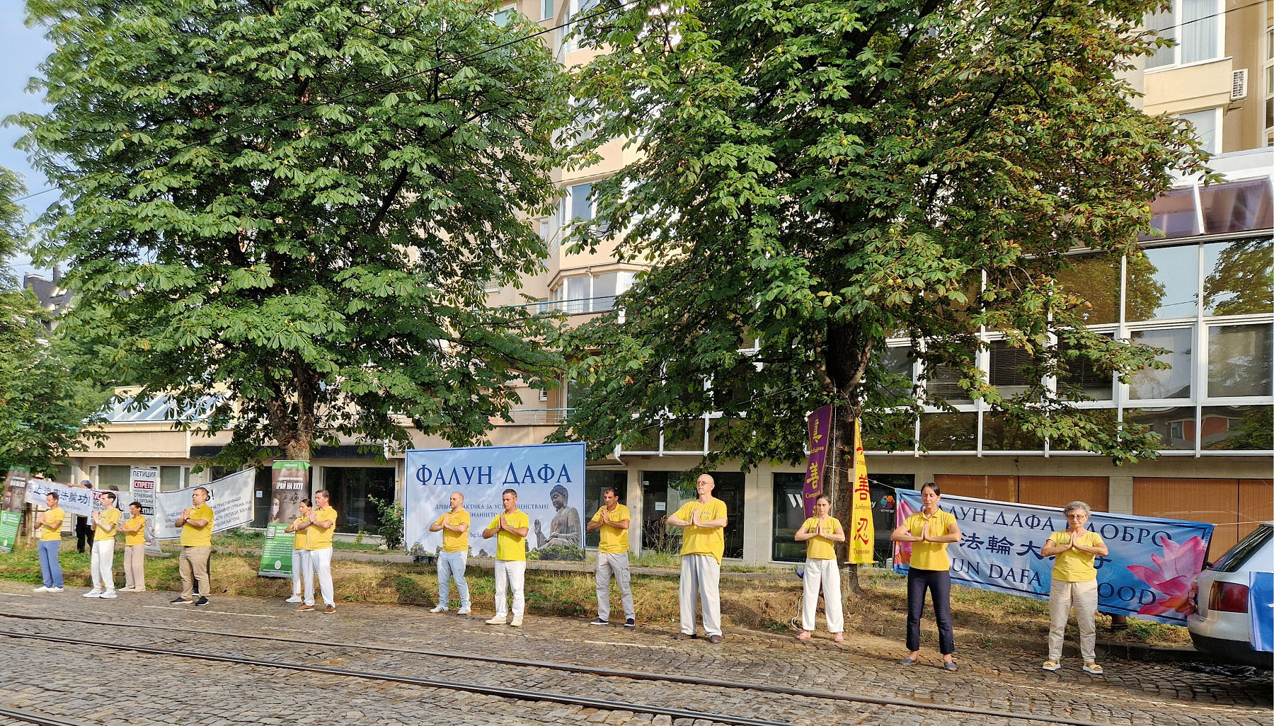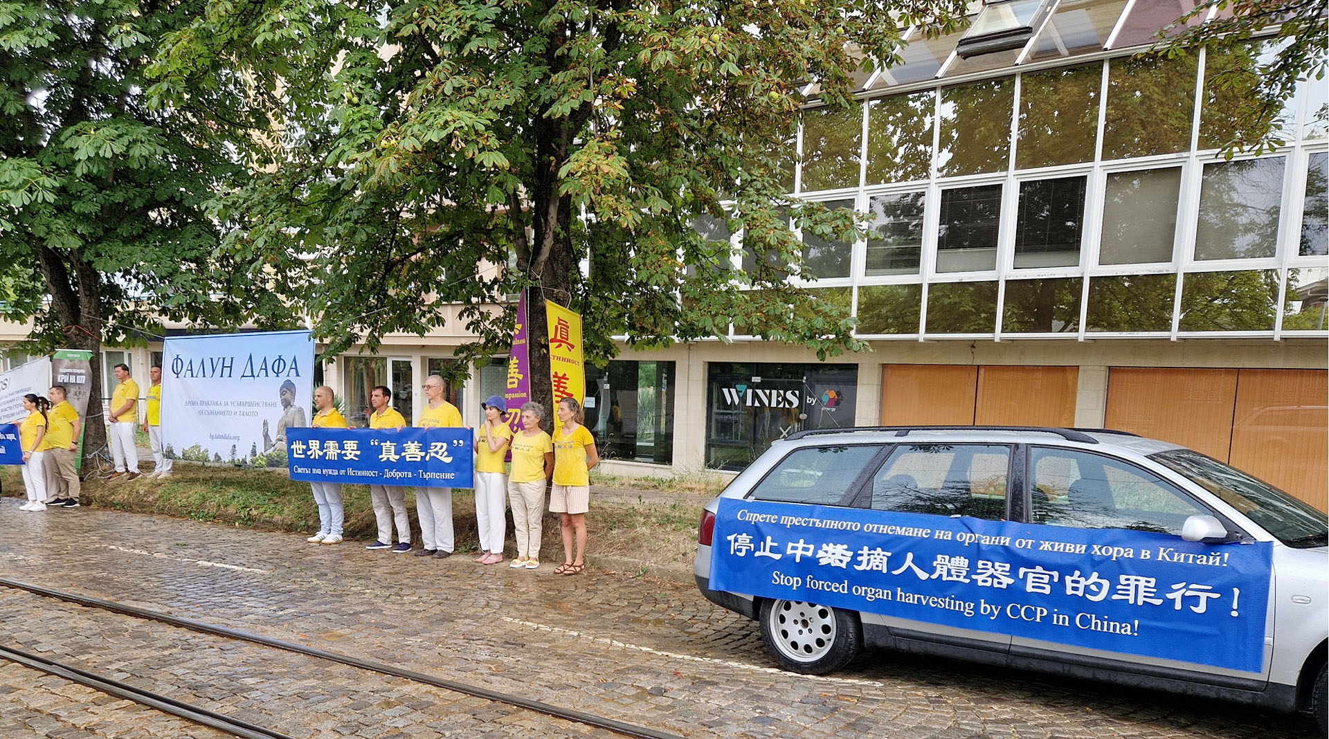 学员们举起多个横幅,上面用保加利亚语、英文和中文写着:“停止活摘中国法轮功学员器官”、“SOS!为了受害者 停止活摘器官”、以及“真、善、忍”、“全世界一百多个国家上亿人修炼”、“法轮大法 一种传统的身心修炼法门”等。