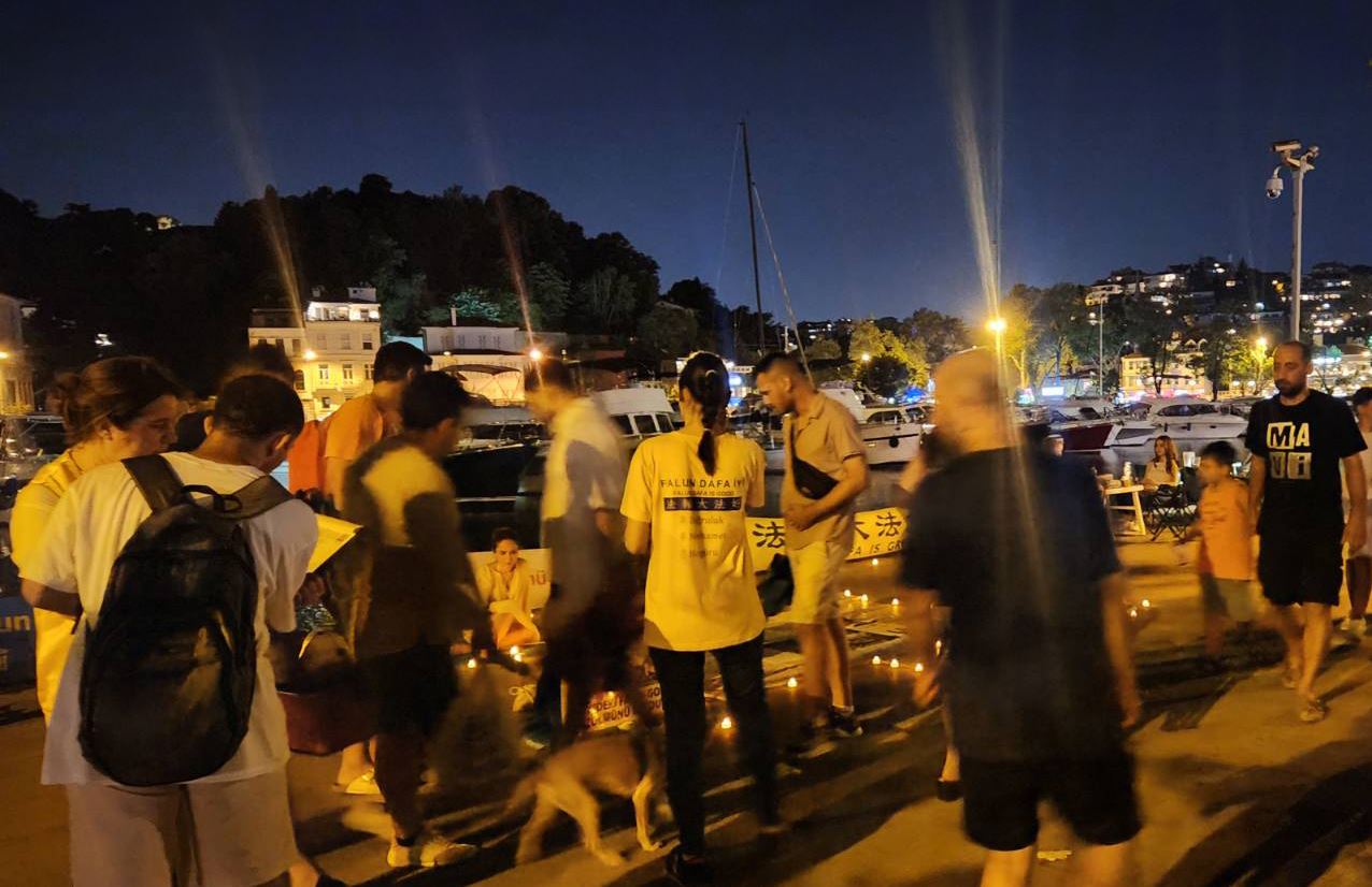 七月二十日晚,学员们再次来到中领馆前,悼念在中共迫害中丧生的中国法轮功学员。活动现场很多民众前来了解真相。许多人对迫害表示震惊和谴责,还有人用手机记录了活动的过程,有民众读完资料后主动在结束中共迫害的征签表上写上自己的名字。