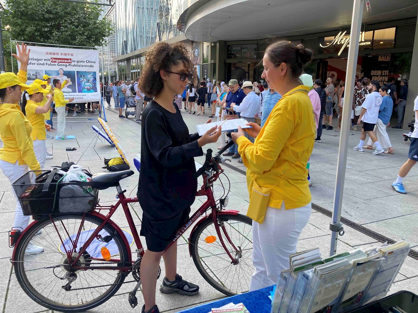 一位女士骑着自行车,在摆放签名单的桌子前停了下来。学员跟她说明中共的迫害后,她迅速拿起笔,在所有的请愿书上签了名。然后她对学员说:“我们要团结起来,共同反对这场迫害。”