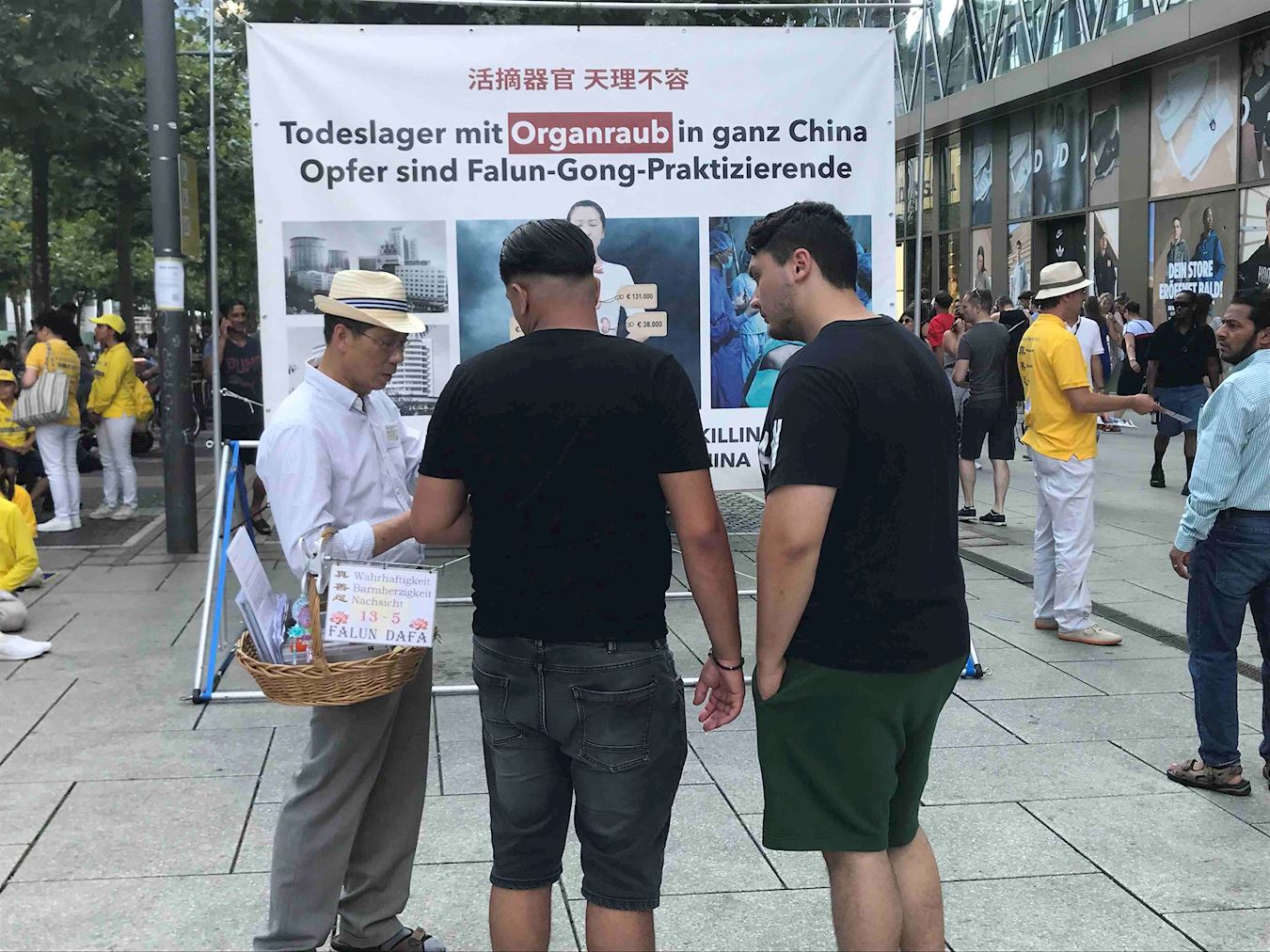 一位年轻人站在一旁观察学员们的活动,然后他向一位学员了解什么是法轮功。他对真、善、忍的价值观尤其感兴趣,他认为这些价值观会给人们带来持久的幸福。谈话结束后,他报名参加了两天后在法兰克福举办的九天班,希望能进一步了解法轮功。