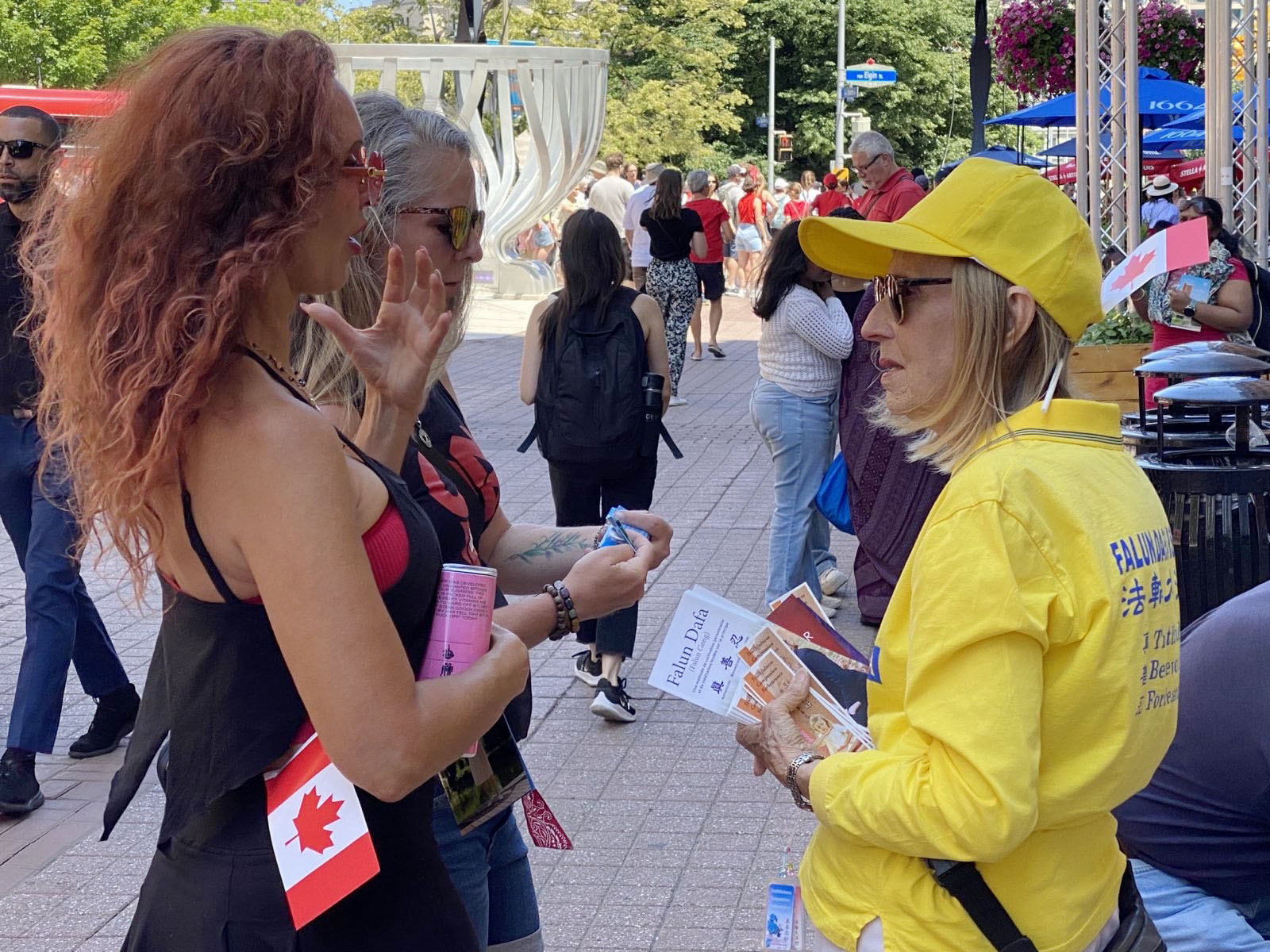 渥太华居民刘女士看到法轮功集体炼功的场景后,也很感兴趣,并向学员询问炼功点的信息,希望能学功。刘女士非常认同法轮功真、善、忍的信仰,她认为,人无善念对社会来说是危险的。“人和人之间一定要有善,如果这个社会没善的话,个个都是那么自私,比如现在的中国,老人摔倒了都没人敢扶。”
