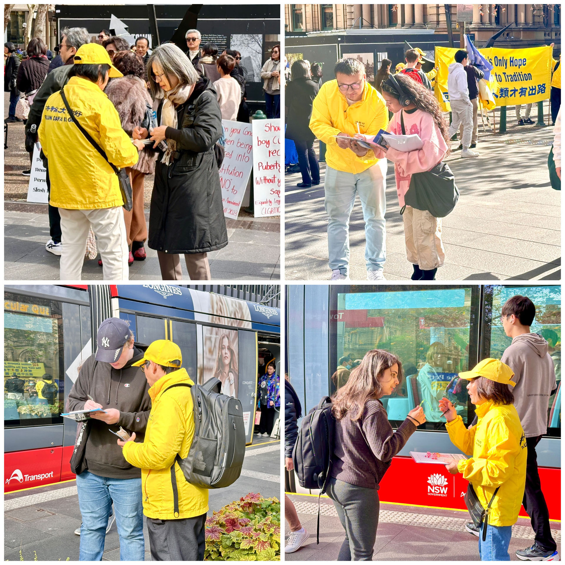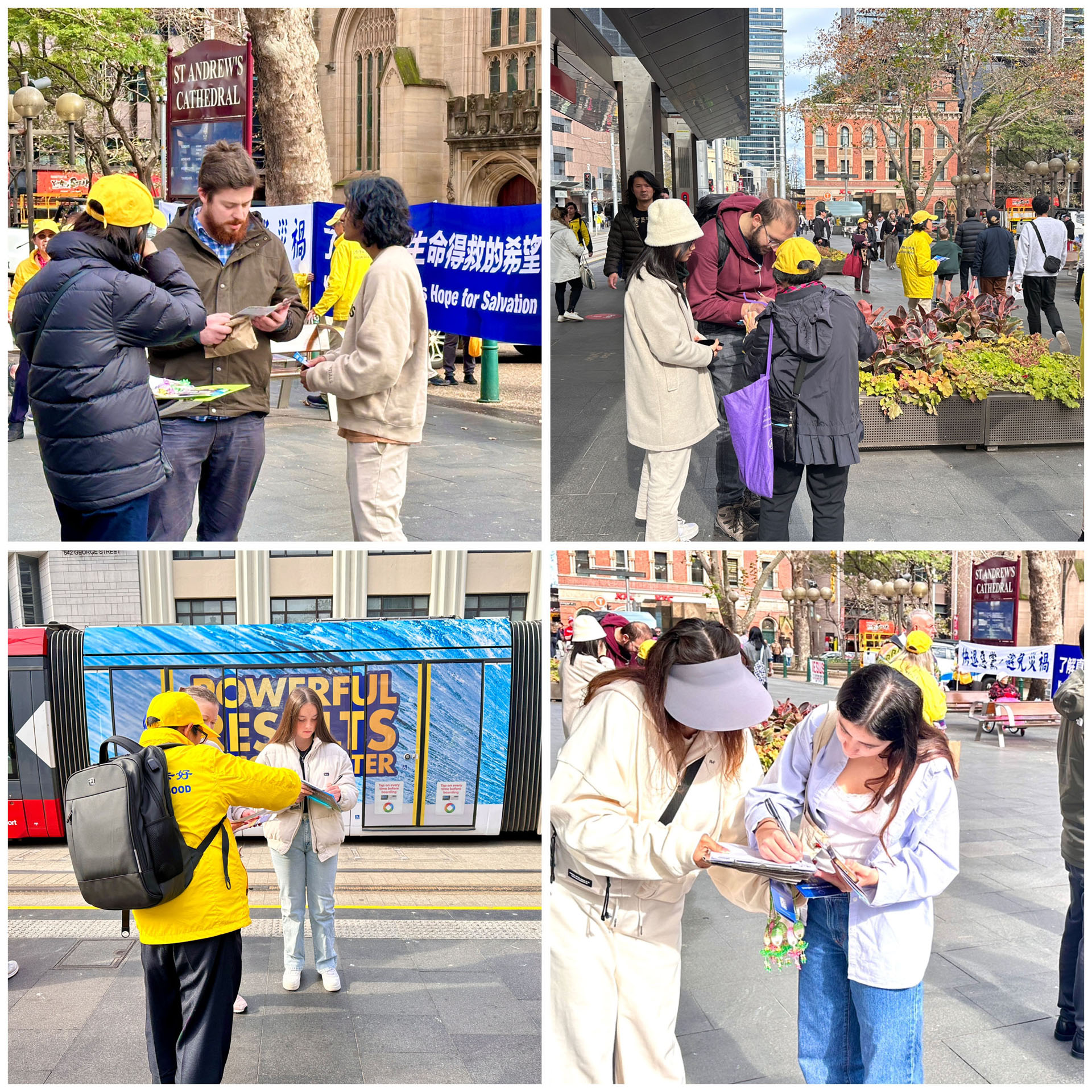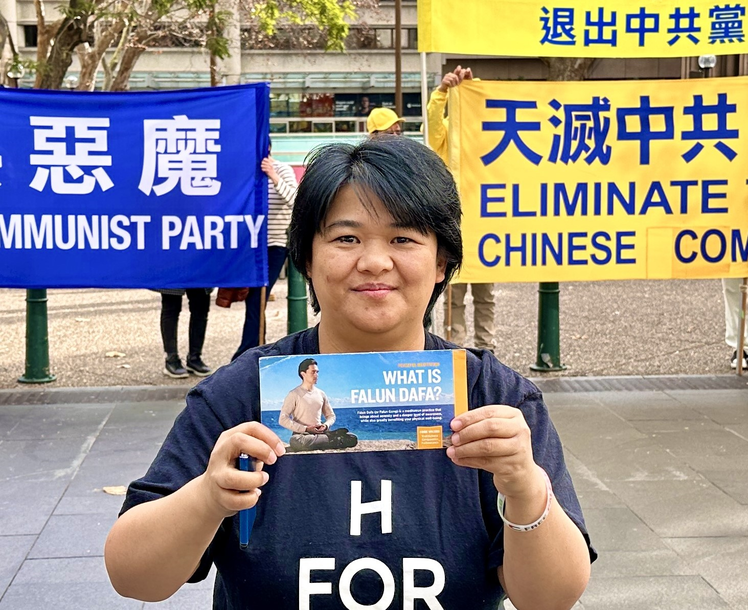 “第三点,我希望澳洲政府、澳洲公众和整个国际社会,都来支持法轮大法。美国政府正在带领其它各国政府打击中共暴政。六月二十五日,美国国会众议院一致通过《法轮功保护法案》。从人性的角度来说,中共对本国民众的迫害也要受到国际的制裁和惩罚。当所有共产暴政的受害者联手起来共同和邪恶战斗,得到更多的国际支持,我们一定能取得最终的胜利!”