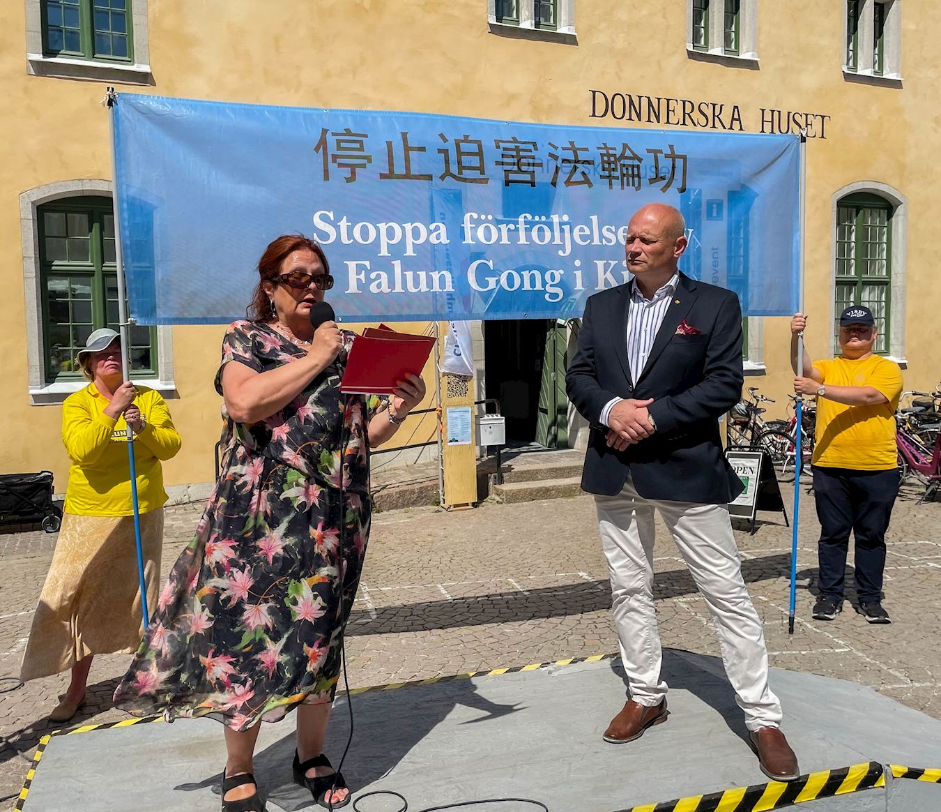 六月二十七日中午,瑞典国会议员、前副议长洛塔·约翰松·福拿尔维(Lotta Johnsson Fornarve)亲临活动现场声援法轮功并发表演讲。