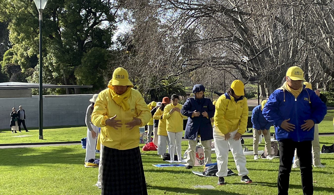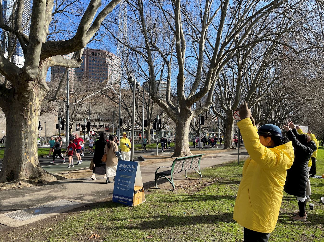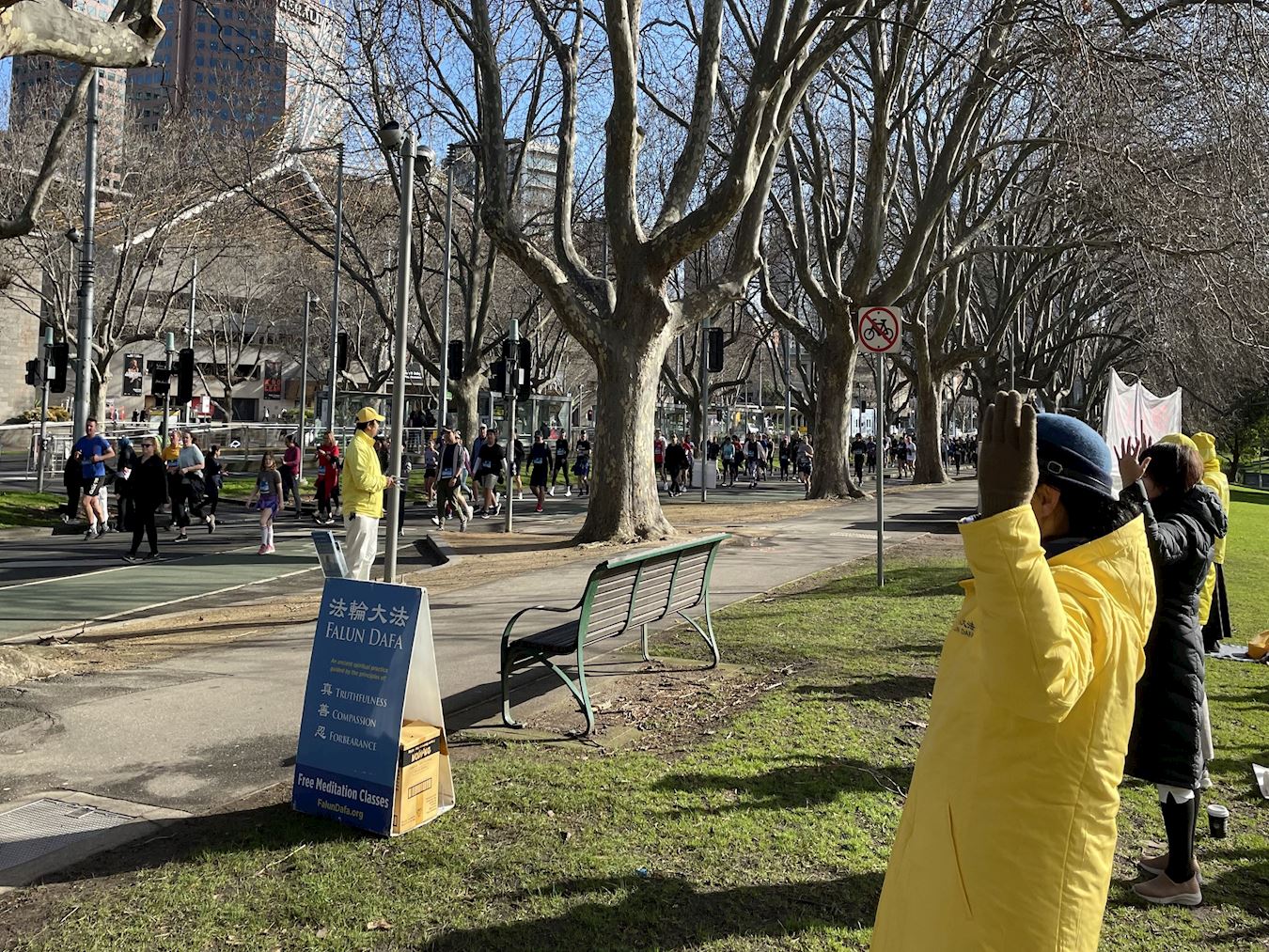 七月二十一日,墨尔本市中心举行了万人慈善长跑活动,长跑爱好者们目睹了法轮功学员们祥和的炼功场景和醒目的横幅信息——“法轮大法”,“在中国长达25年对法轮功的迫害和虐杀必须停止”。来自俄罗斯的一对移民夫妇,被晨炼的场景吸引,长时间驻足拍摄,他们表示,真、善、忍普世价值“是解决世间难题的一把钥匙”。