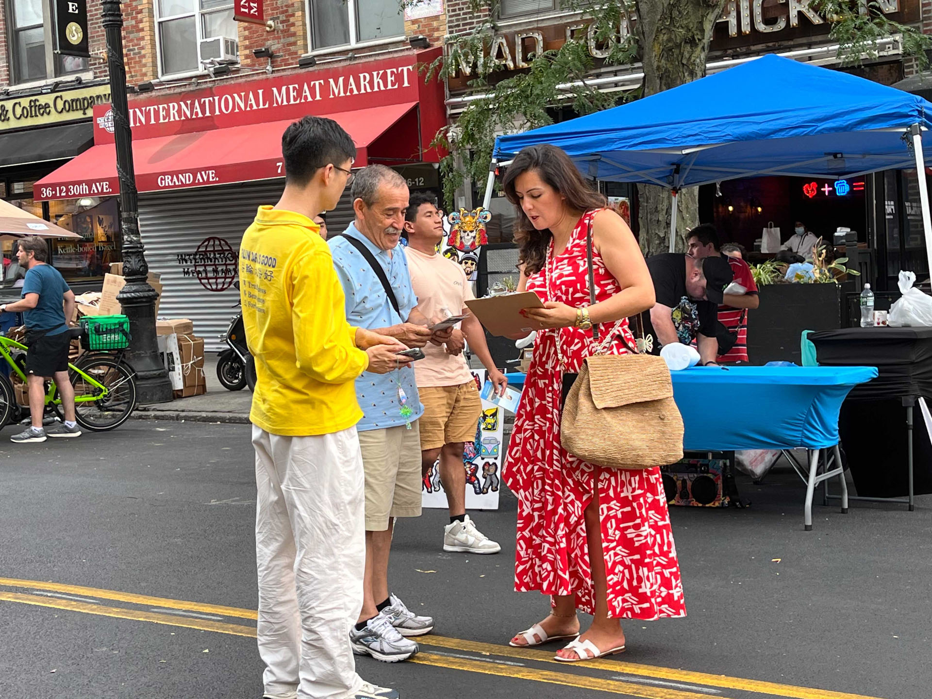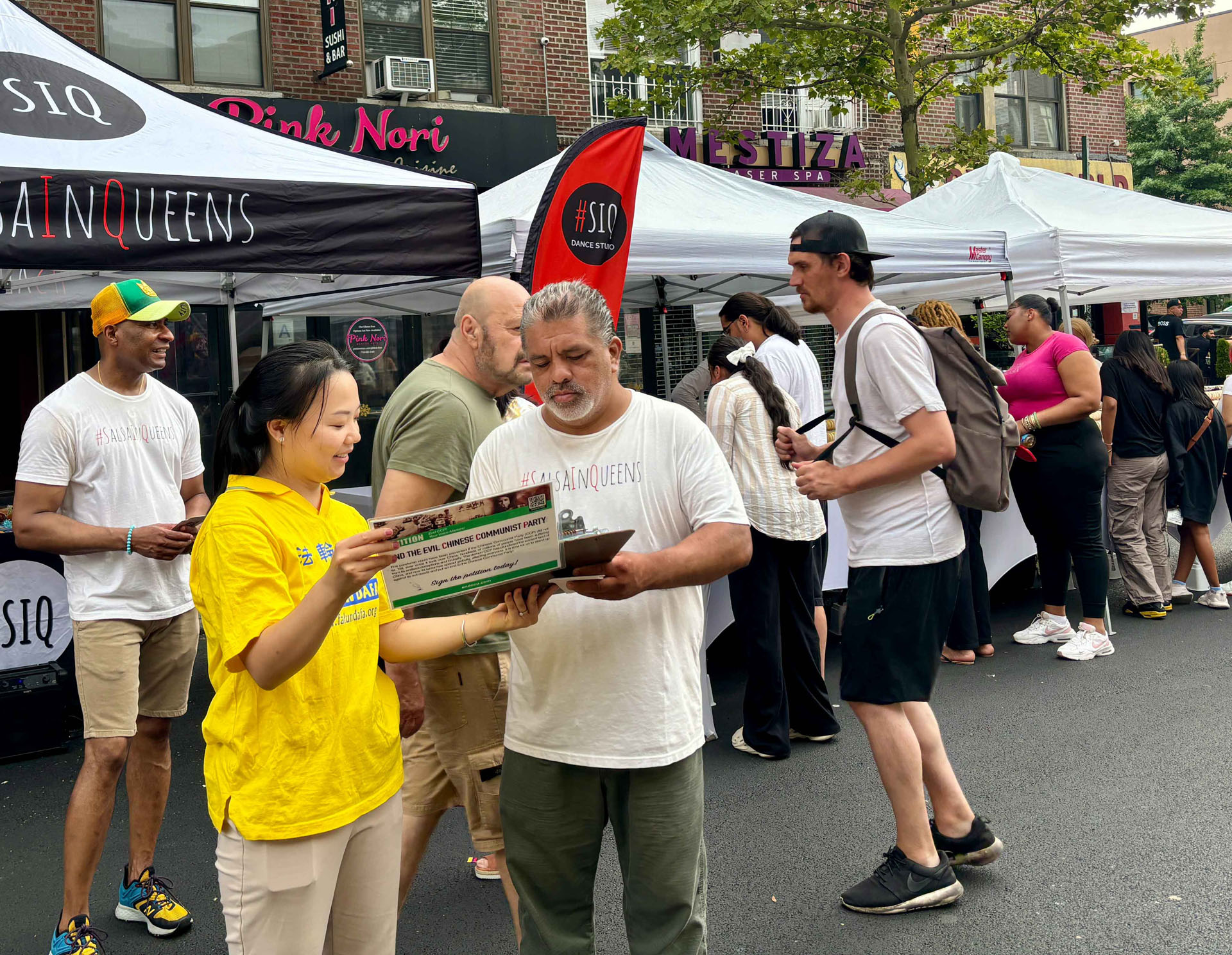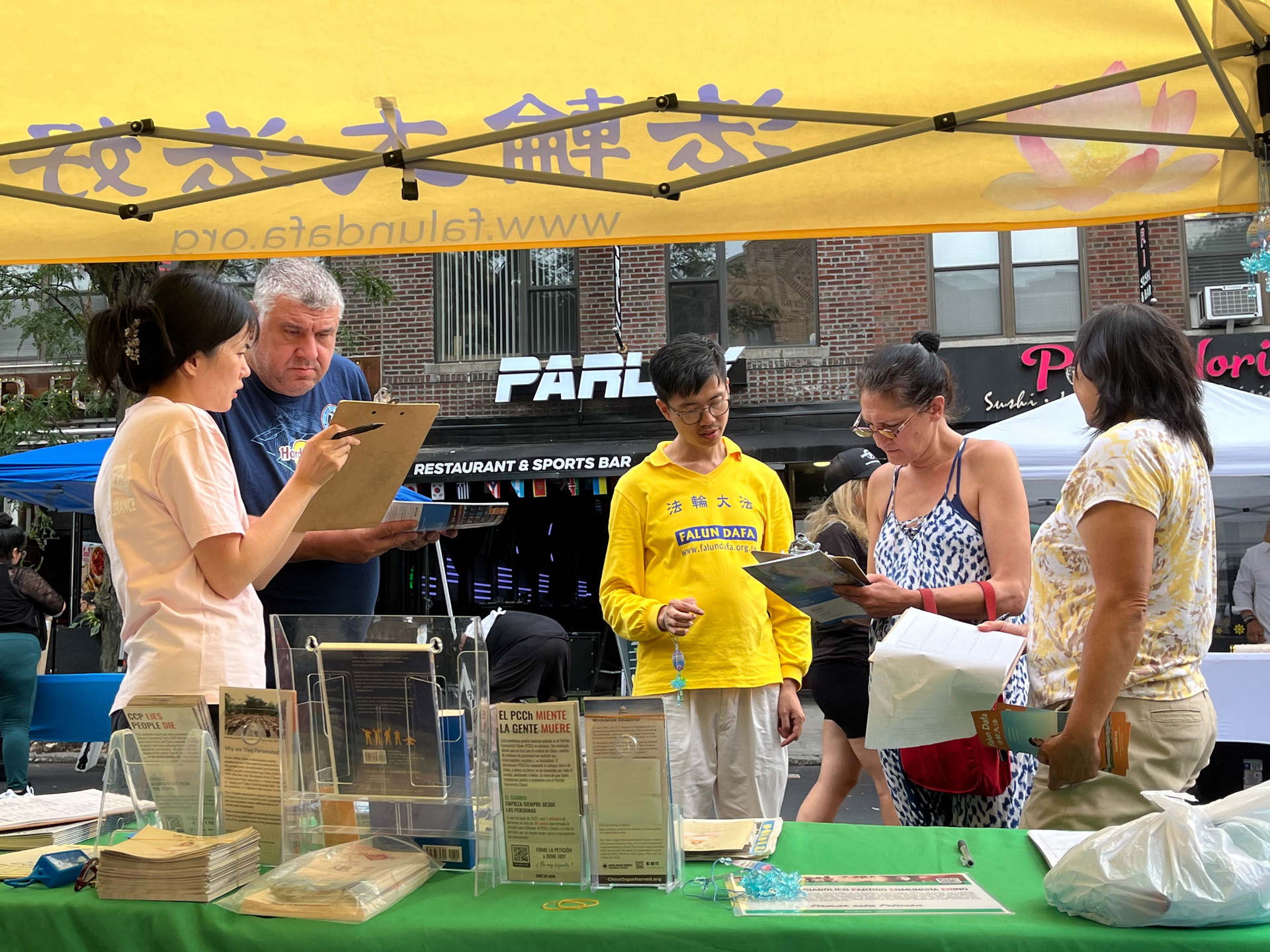过了一会儿后巴基思带来了她的妈妈和弟弟,他们也分别在支持《法轮功保护法案》上签字,并在九天学法教功班报名表上填写了自己的信息。学员也把learnfalungong.com的网站发给了她。巴基思还说希望明年的街市还能看到你们!谢谢你们!