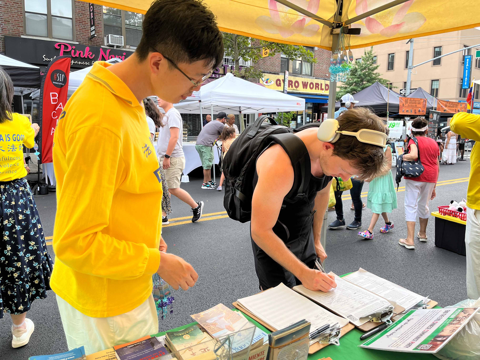 ![]() 图4~9:有不少游客前来了解法轮功,有人报名参加法轮功九天学法教功班,也有人在美国众议院刚通过的《法轮功保护法案》上签名支持。 |