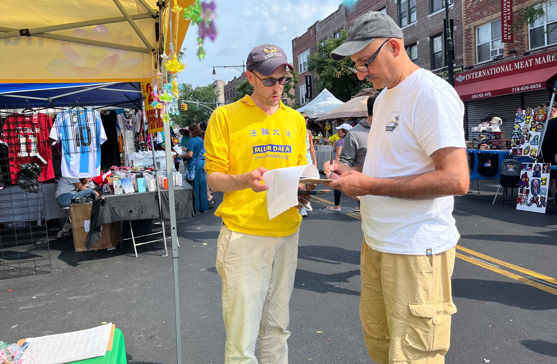摊主老板和他的同事,听闻了真相,分别签名支持人权信仰,对学员说:“加油!我们支持你们!”