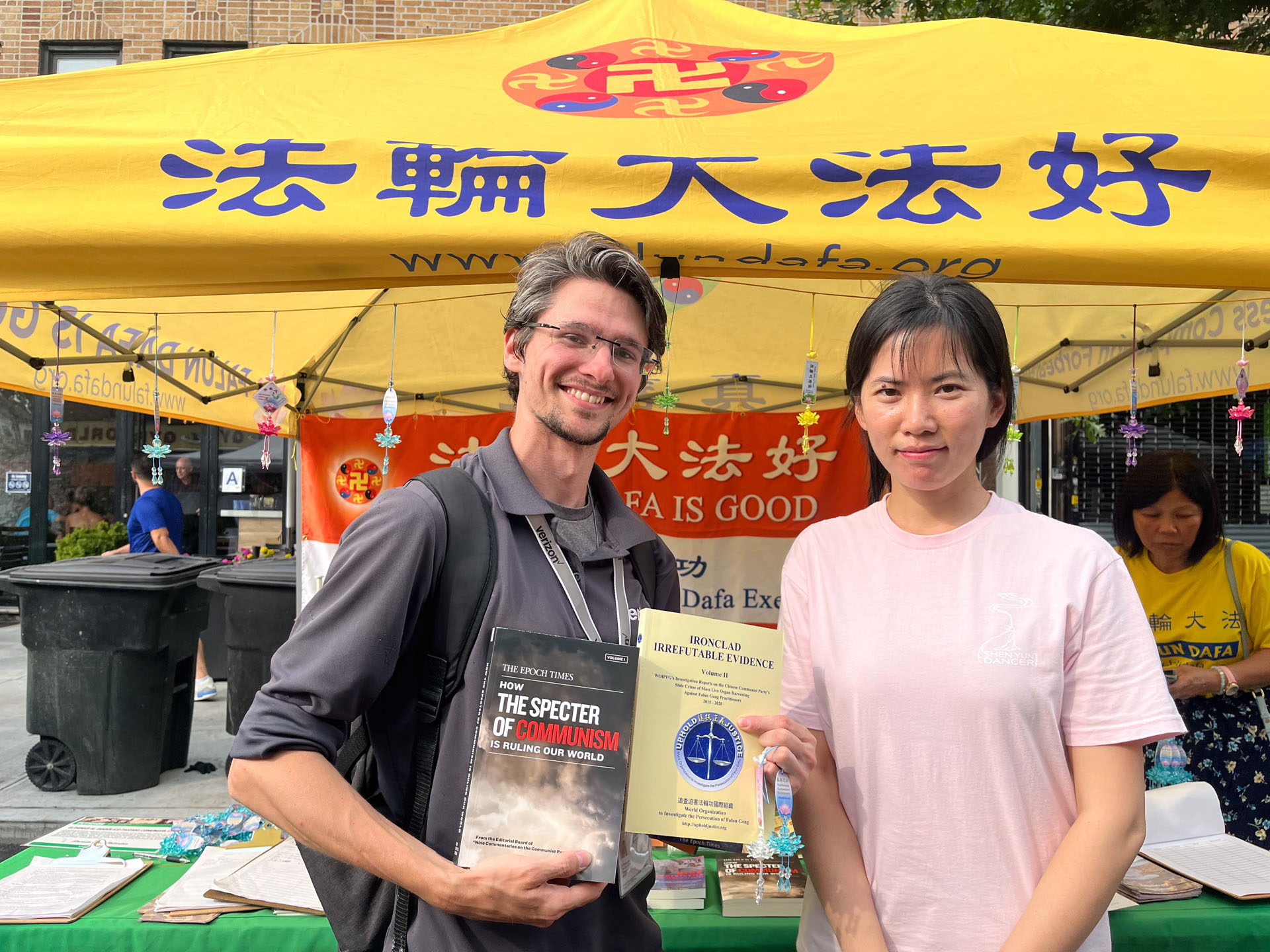 游客克里斯(Chris)路过法轮功展位,停下来与学员交谈,克里斯说他对中共有一定的了解,“我对真相比较感兴趣,知道中共做了很多坏事,我也喜欢阅读。”学员向他推荐了相关书籍《九评共产党》、《铁证如山》、《魔鬼在统治着我们的世界》。他很高兴并拍照,想把照片传送和推荐给他的一个生意上的合作伙伴,学员说:“你可以带走这三本书,并且你读完后可以转赠给你的朋友。”
