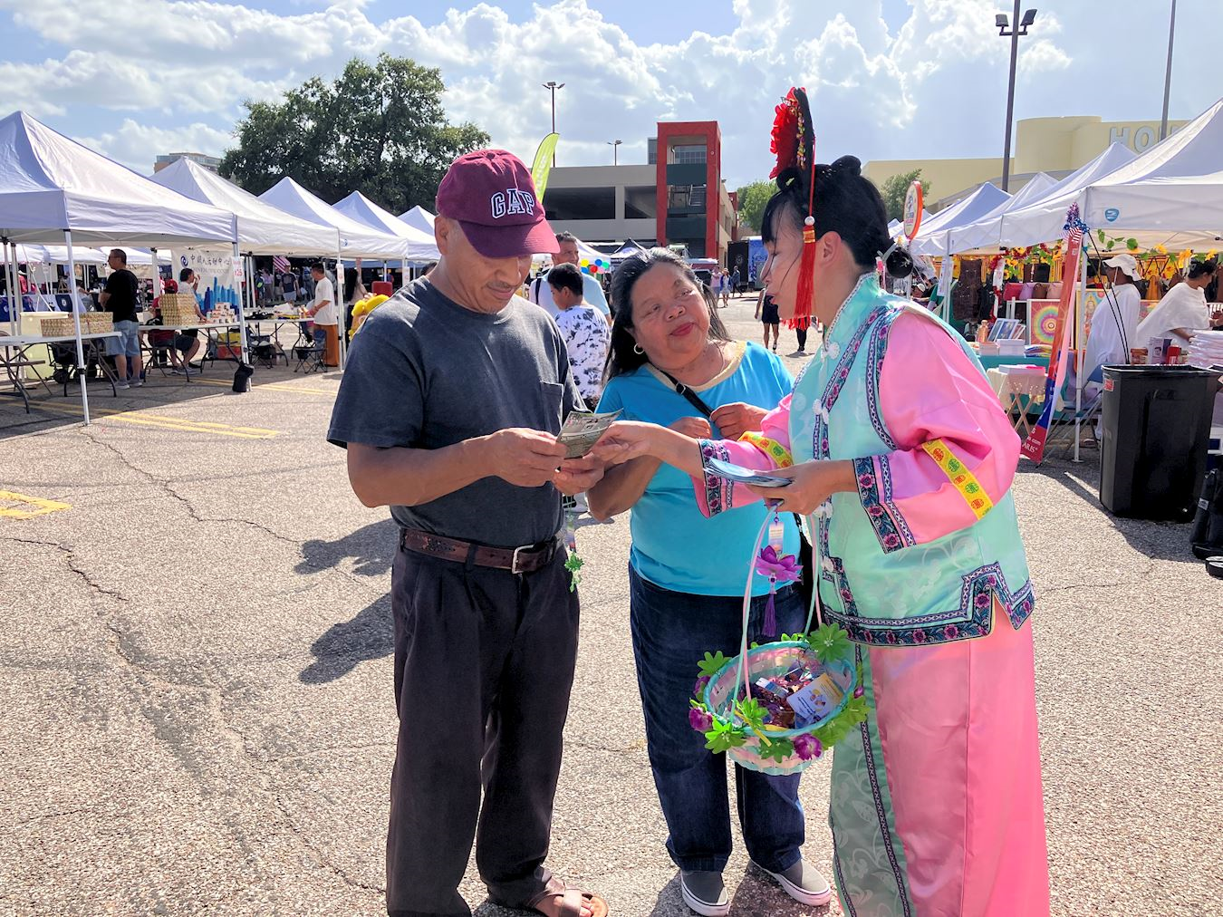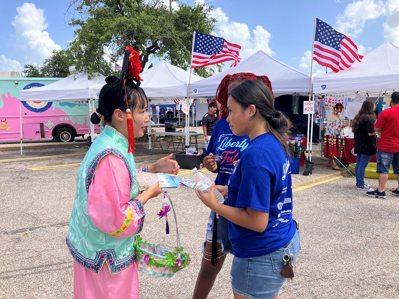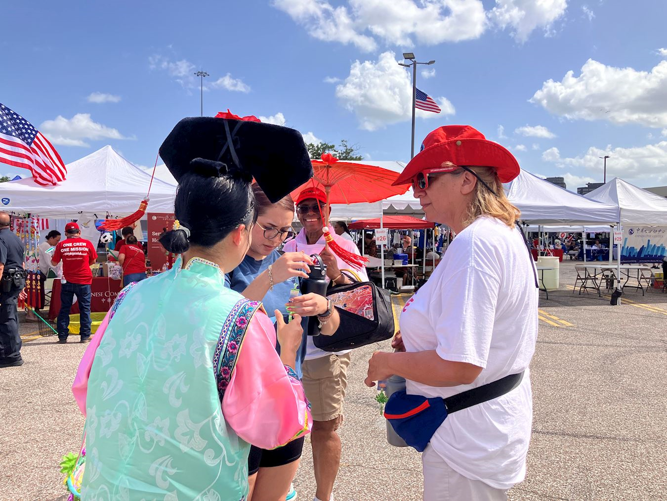 来自休斯顿和圣安东尼奥的法轮功学员设置了真相展位,他们展示舒缓优美的五套法轮功功法,向游客免费赠送书法作品,身着中国传统服饰的学员分发真相资料,讲述大法的美好。
