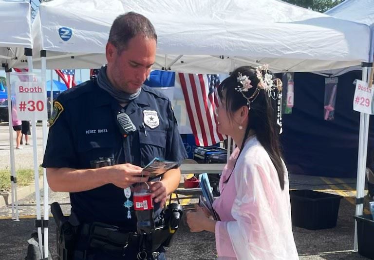 许多来往民众纷纷驻足,他们阅读真相资料,称赞法轮功学员展现了善良和美好,有人拿起相机,记录下法轮功展位上的精彩瞬间,还有人现场学炼五套功法。学员告诉民众美国国会众议院上周刚刚全体通过了《法轮功保护法案》,许多人表示支持。