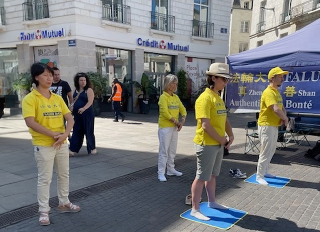 ![]() 图1:法轮功学员在南特市中心的皇家广场演示法轮功功法。 |