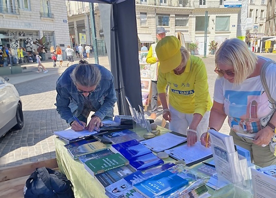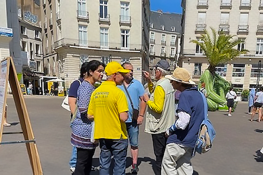 在法国南特市中心皇家广场前,学员设置真相展位上,许多民众和游客看到真相的标语和横幅,纷纷前来了解这场迫害的真相。当听完学员告诉他们真相后,许多人在请愿书上签名支持法轮功,希望尽快停止迫害。