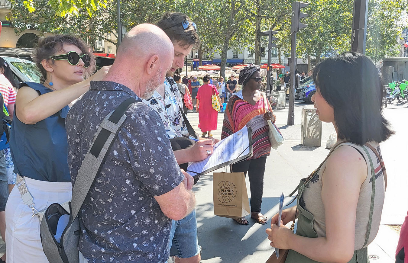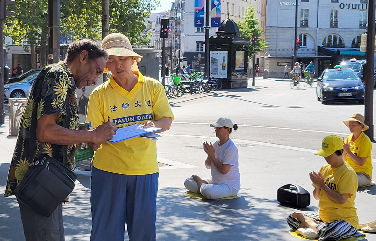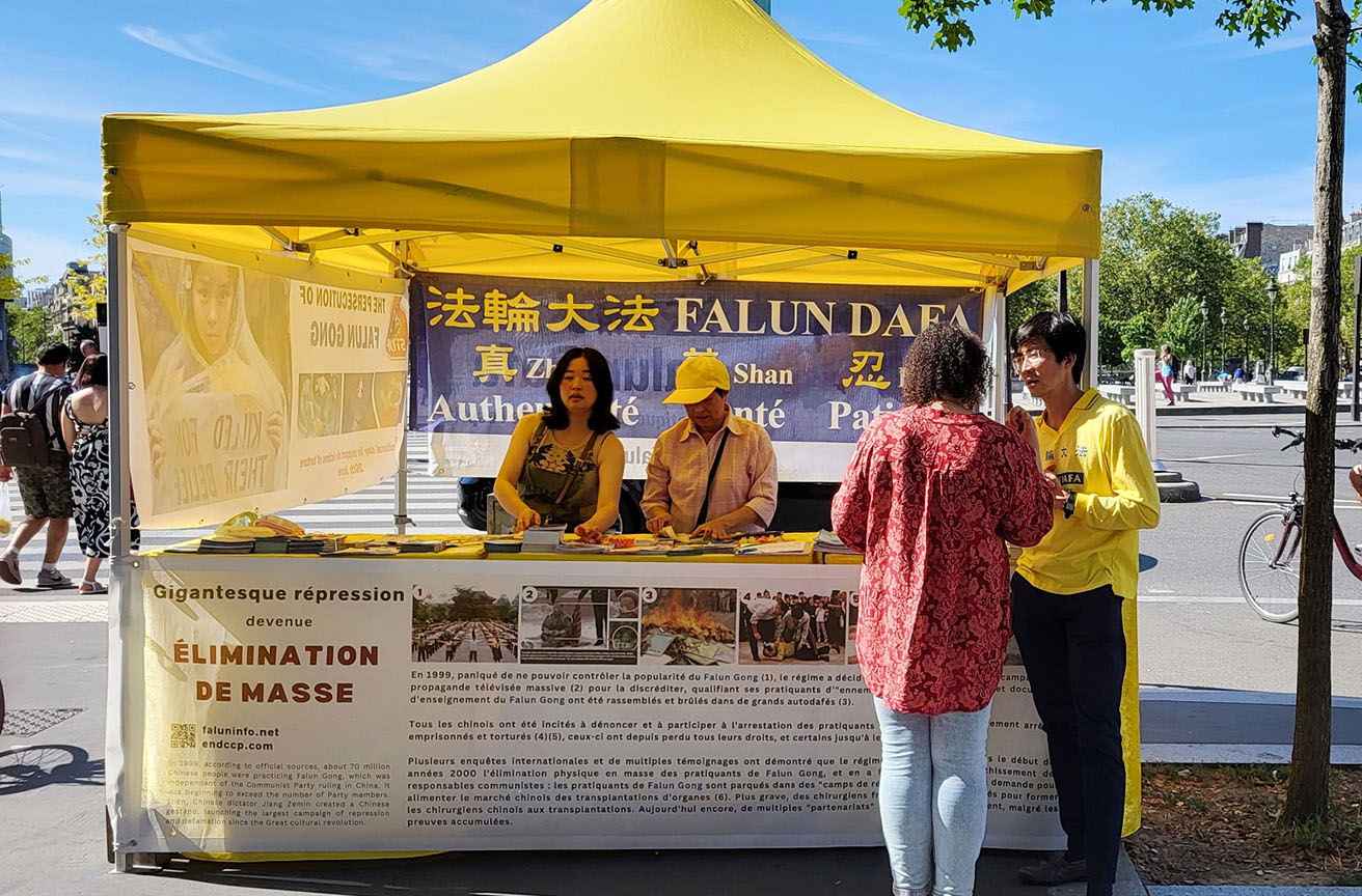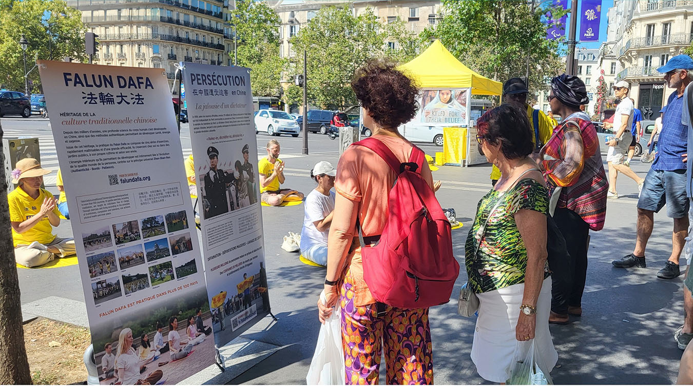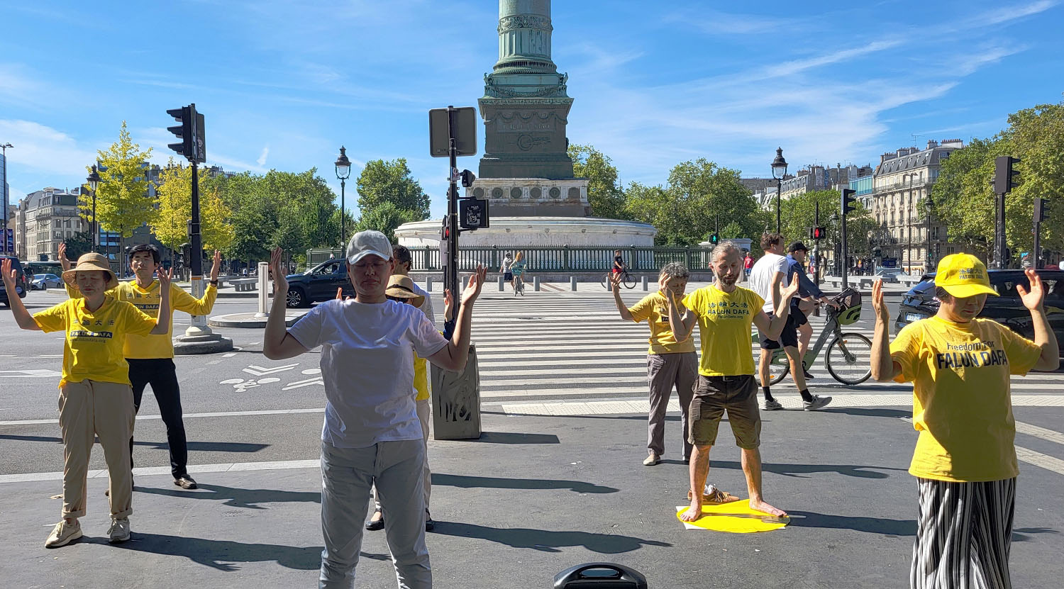二零二四年八月十一日上午,法轮功学员在巴士底广场(Place de Bastille)举办了法轮功信息日活动,向民众和游人介绍法轮功,同时征集签名,反对中共对法轮功学员的迫害。