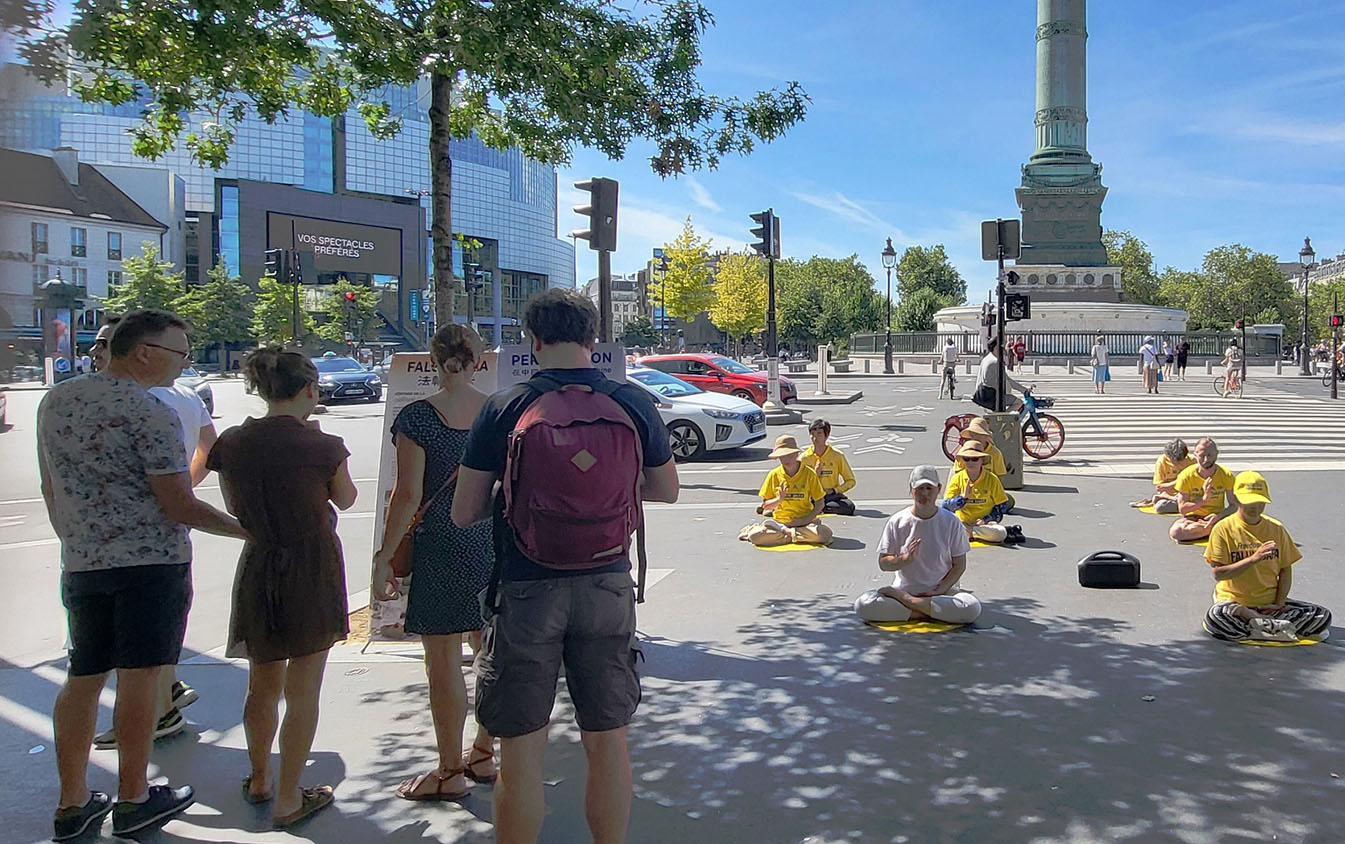 巴士底广场是巴黎的重要旅游景点,这天也是二零二四年巴黎奥运会闭幕的日子,很多游人在巴士底广场遇见了法轮功。他们拍摄法轮功学员炼功照片,有的主动向学员拿取法轮功真相资料。人们对中共的残酷迫害法轮功学员表示震惊和愤恨,有些人想学炼法轮功。