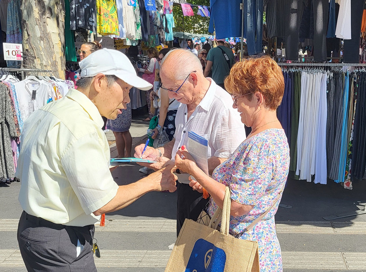 他说:“你们在这里所做的事情需要很大的勇气。”多哈梅尔继续说道:“幸运的是,在法国,我们享有言论自由,我们国家非常重视这项权利。我们理解那些在中国以及所有‘独裁国家’无法享有这项权利的人民,我们在法国会尽力支持他们。我们必须支持所有民族的自由,让他们能够有自觉、自由地生活,能够自由表达他们的想法,并按照自己的意愿生活。”他鼓励法轮功学员坚持下去。