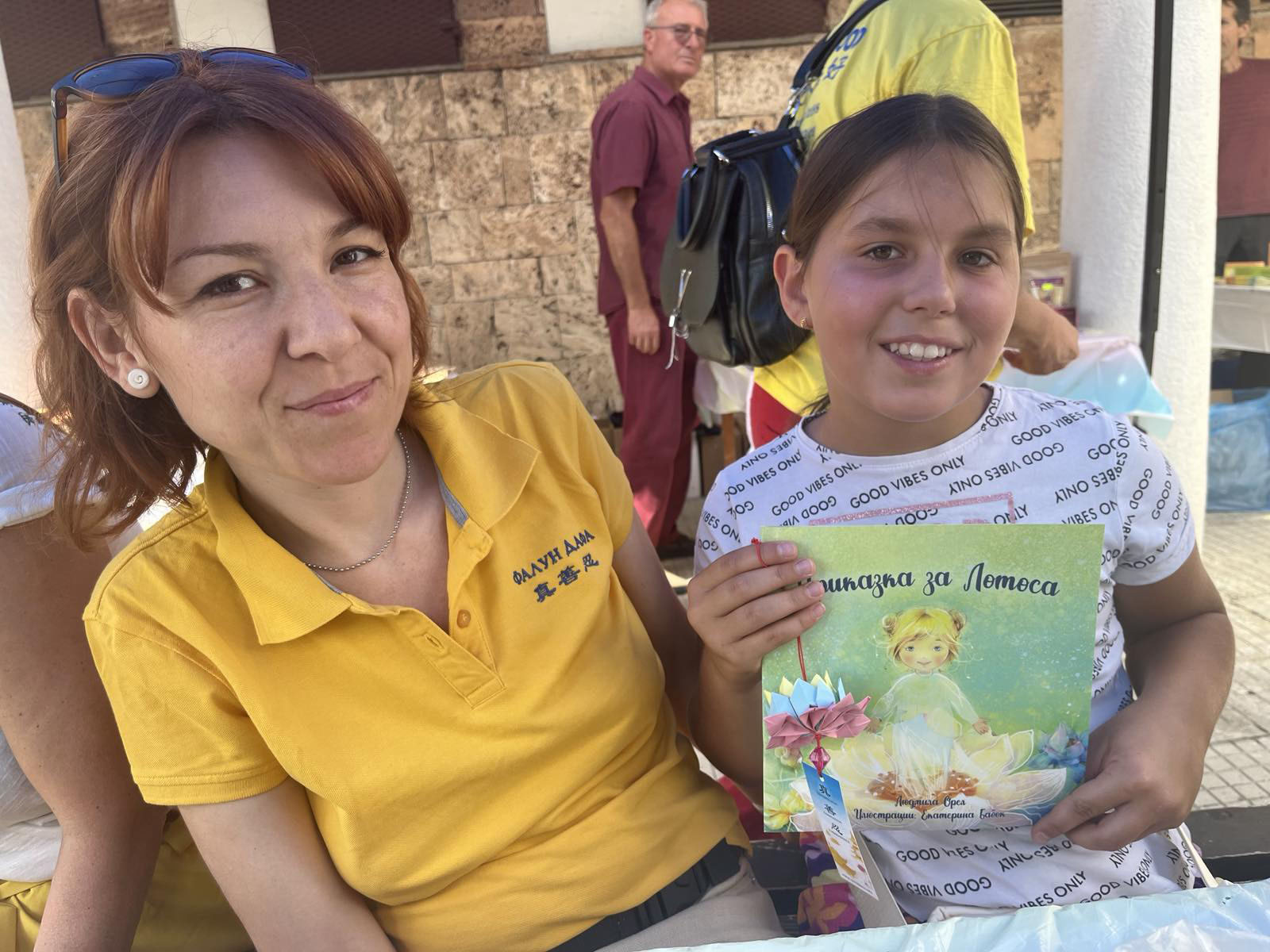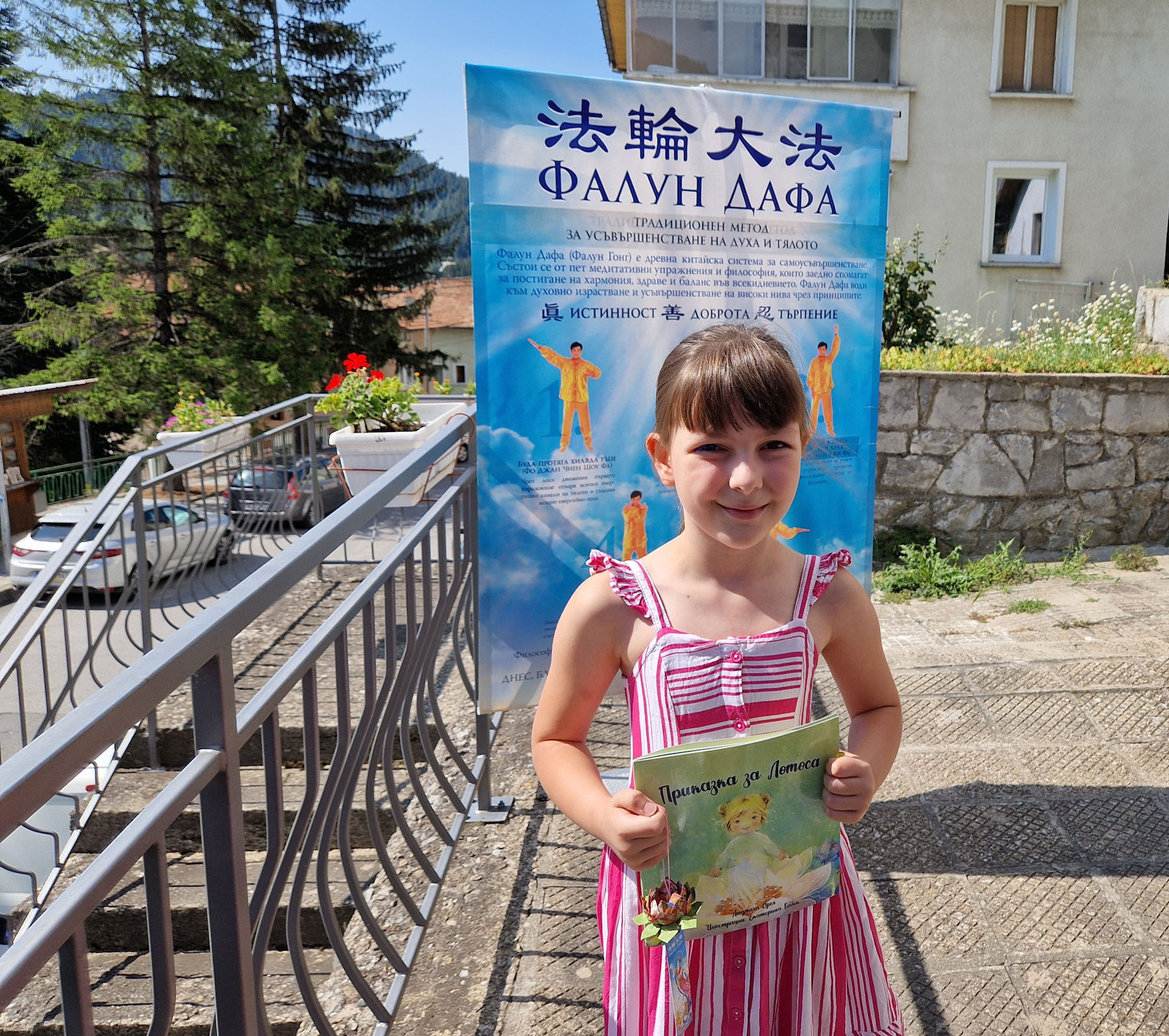 女孩布拉加(Blage)今年八岁,她连续两天都来到法轮功展位。在听了学员讲述的《莲花的故事》后,女孩对书中表现的莲花印象深刻。