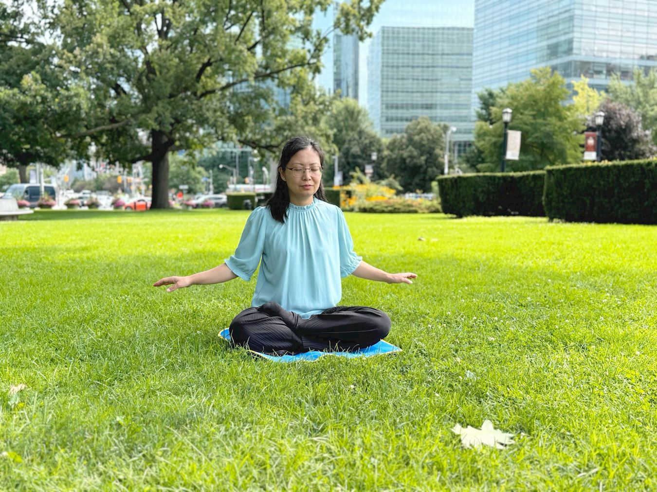 ![]() 图2:谭珺之在炼法轮功的第五套功法——“神通加持法” |