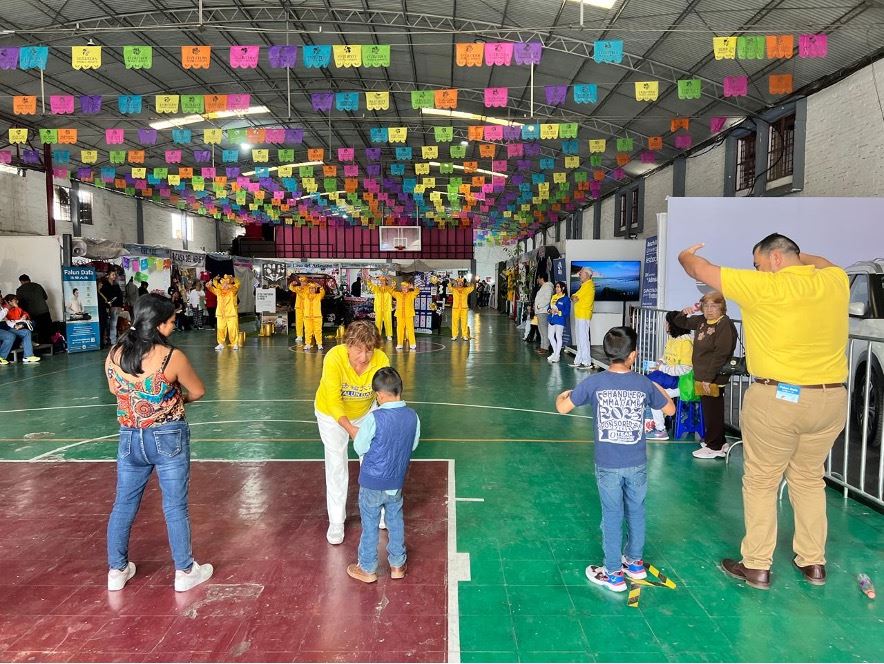 ![]() 图1:二零二四年八月十一日,墨西哥法轮功学员参加了在普埃布拉州北部举行的特齐乌特兰博览会,大人小孩纷纷加入炼功的行列。 |