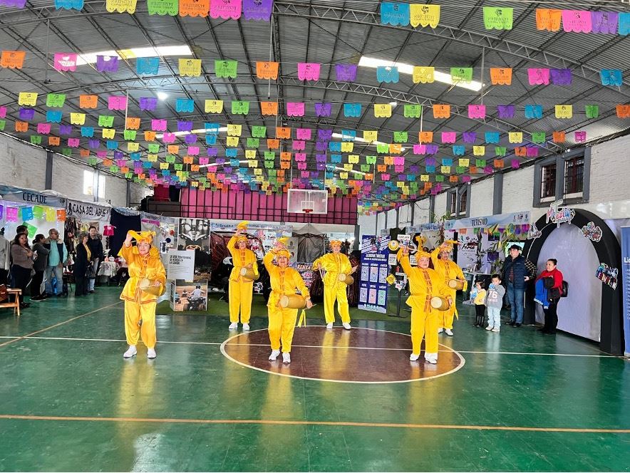 ![]() 图2:二零二四年八月十一日,由墨西哥法轮功学员组成的腰鼓队在特齐乌特兰博览会上演奏乐曲《法轮大法好》。 |