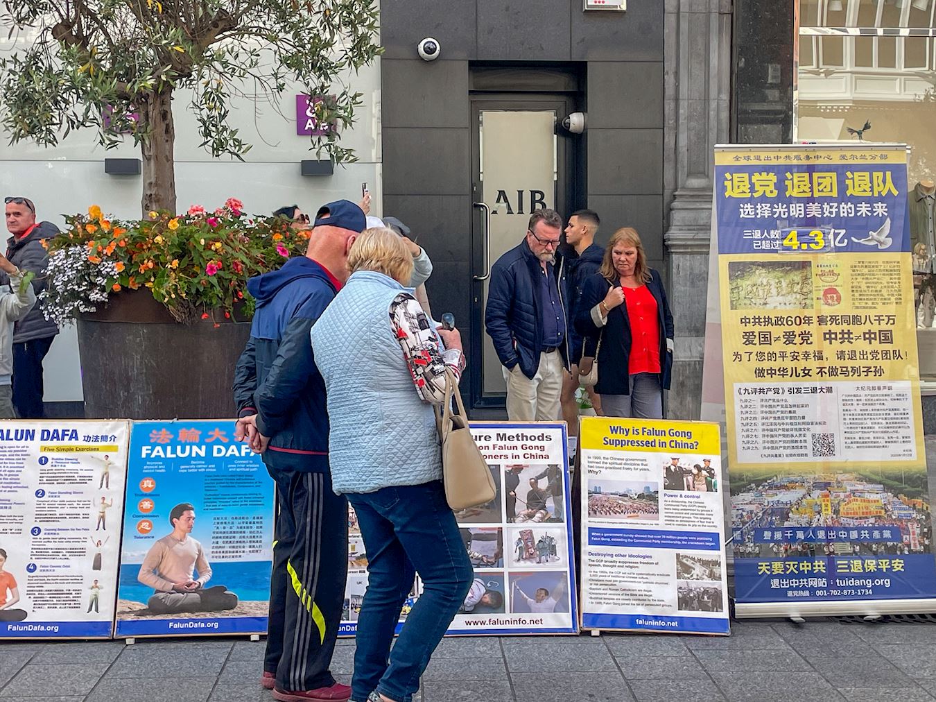 一些在附近居住的华人也会主动帮助学员传真相。来爱尔兰多年的李女士就是其中的一位。一天学员下车不久,就碰见了李女士。她热情地向学员打招呼,“你们这功太好了,看你的眼神儿清澈透明,就知道这是个好功,好好炼!”李女士说。“要不是我父母在国内,我也炼!真、善、忍多好呀!”