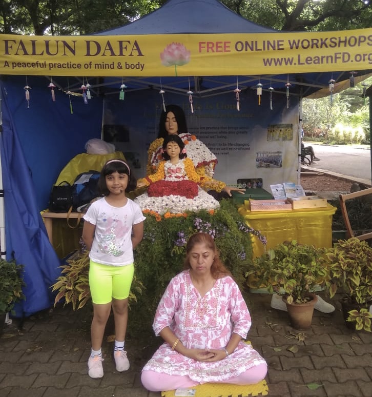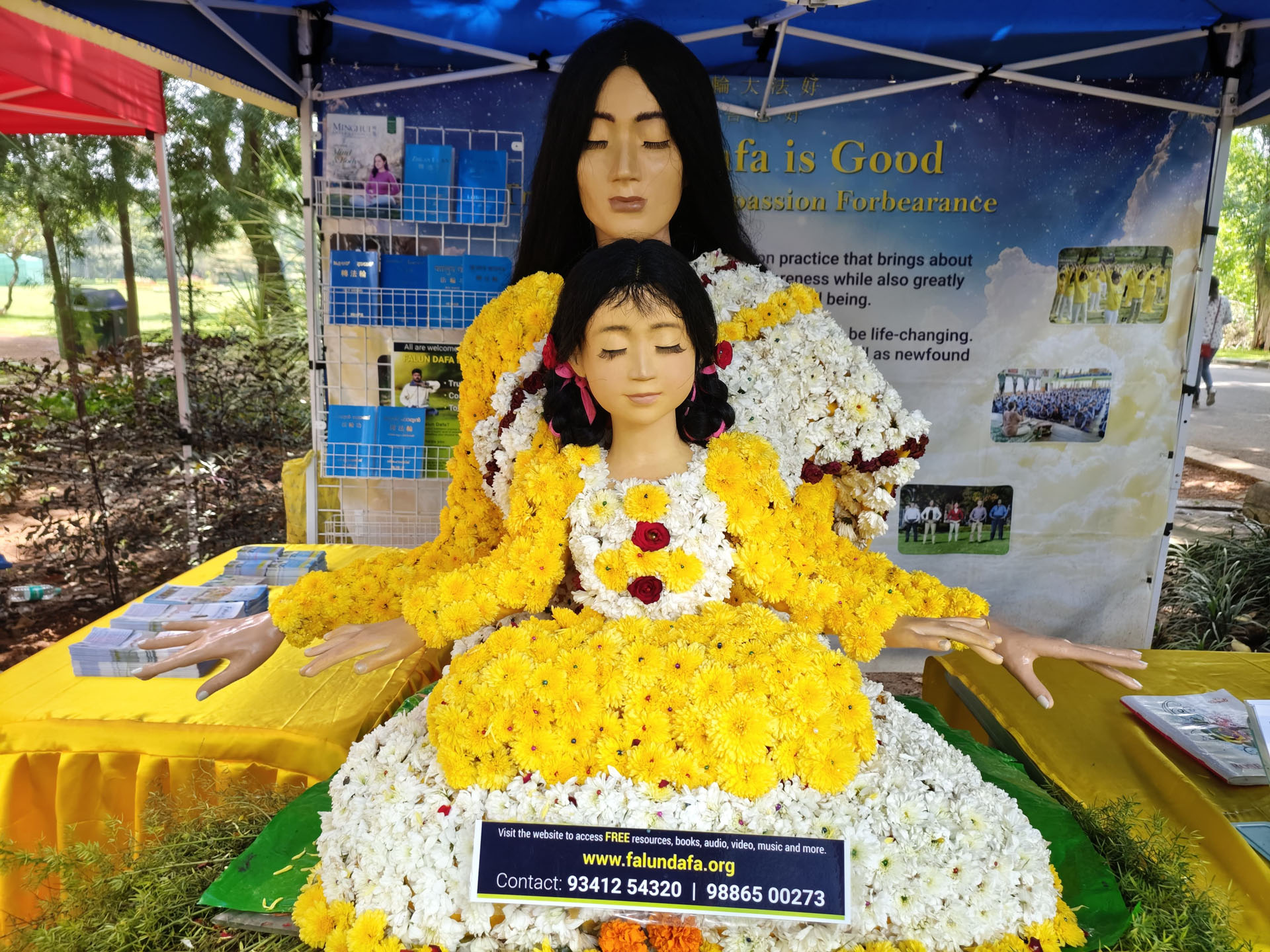 在花卉展期间,法轮功学员们精心设计了一对母女打坐的造型,且每天都会在细节上做出调整,为观众带来耳目一新的视觉效果。现场再加上现场功法演示,让很多观众们驻足拍照并想要了解法轮功。