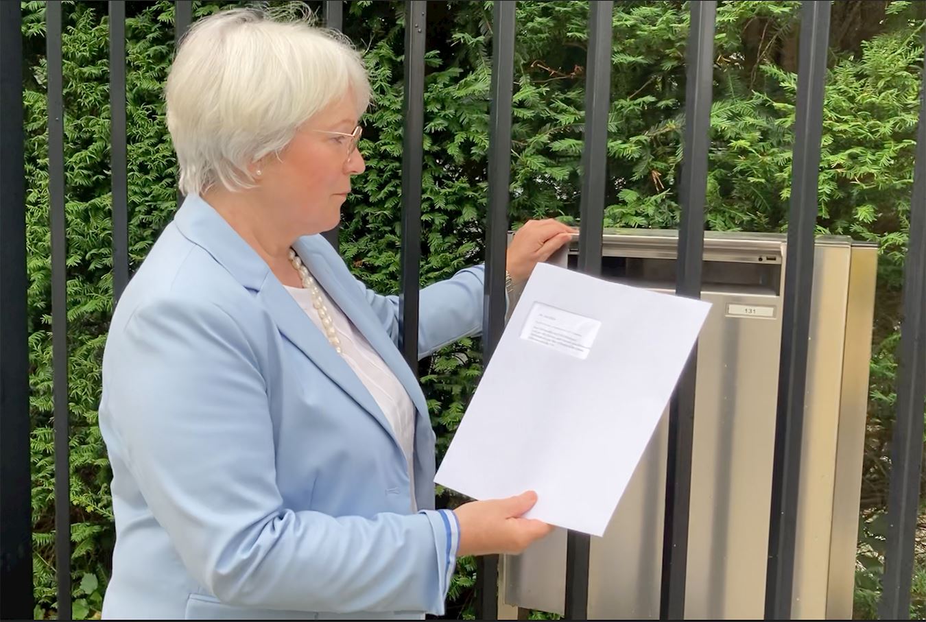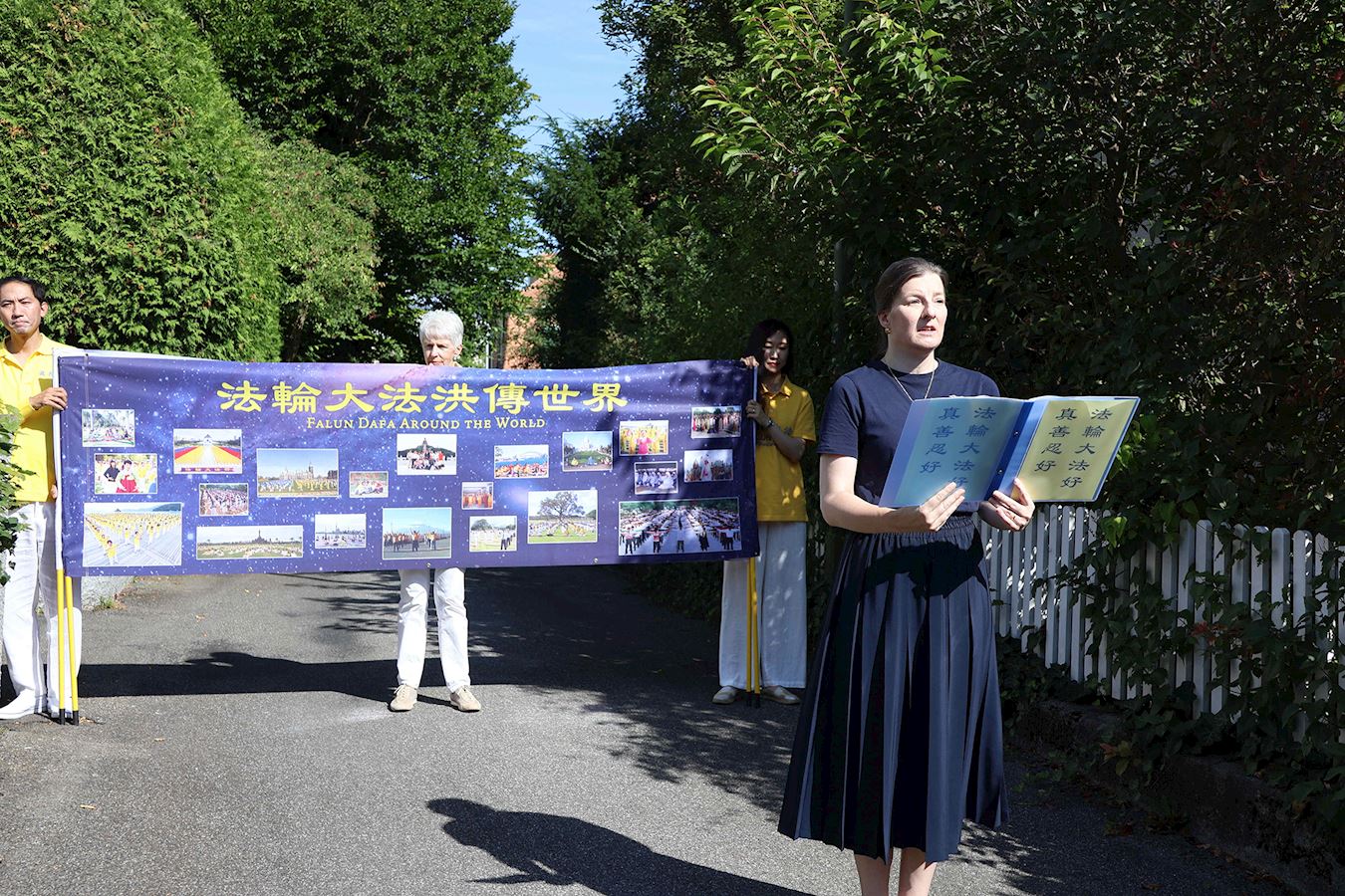 ![]() 图1~2:二零二四年七月二十四日,法轮功学员宣读了致中共驻杜塞尔多夫总领事杜春国的公开信,之后把信函投入了中领馆的信箱。 |