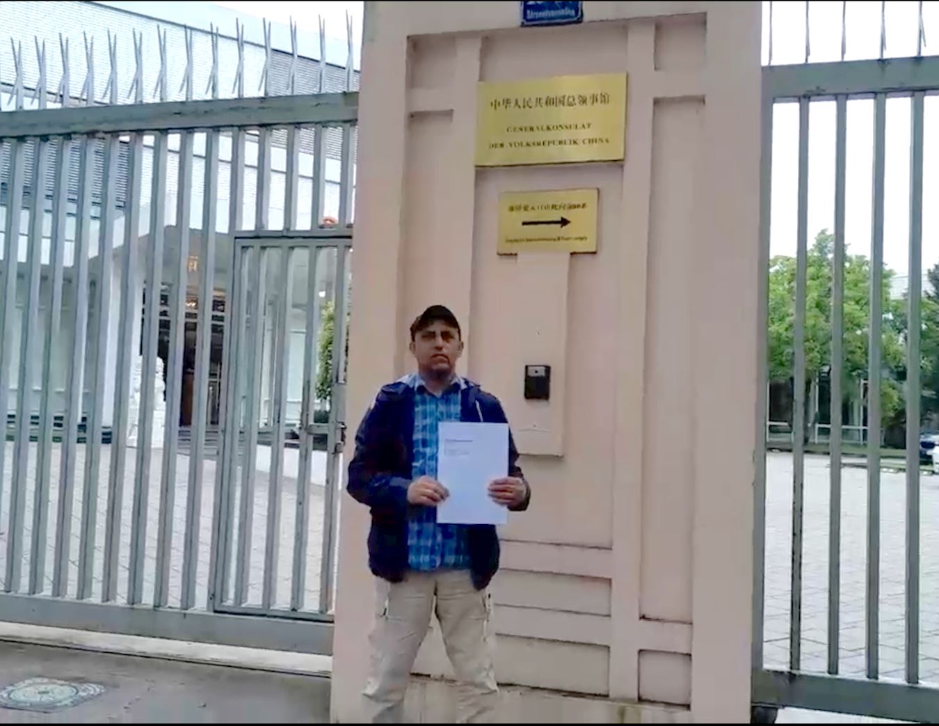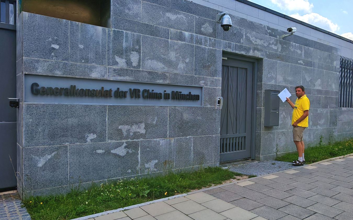 ![]() 图3:七月二十五日,法轮功学员宣读了致中共驻慕尼黑总领事童德发的公开信,之后把信函投入了中领馆的信箱。 |
