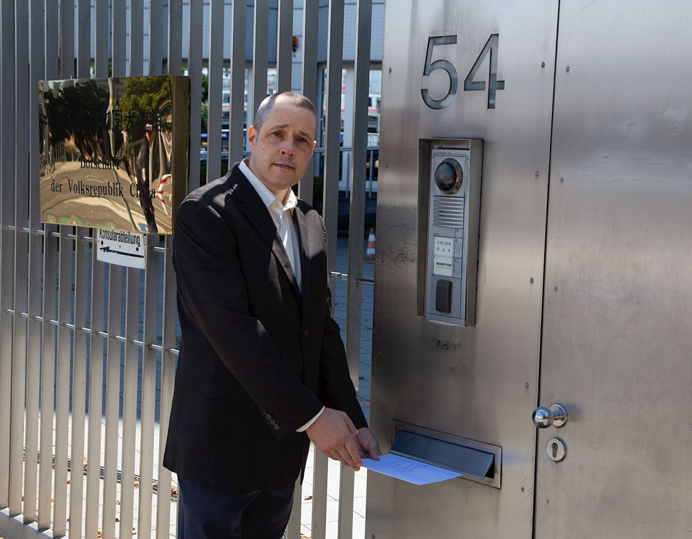 ![]() 图5:七月二十八日,法轮功学员把致中共驻德国大使吴恳的公开信投入了柏林大使馆的信箱。 |