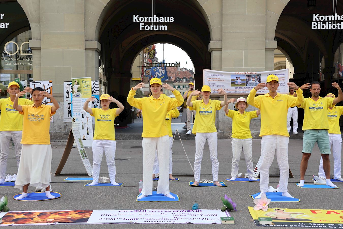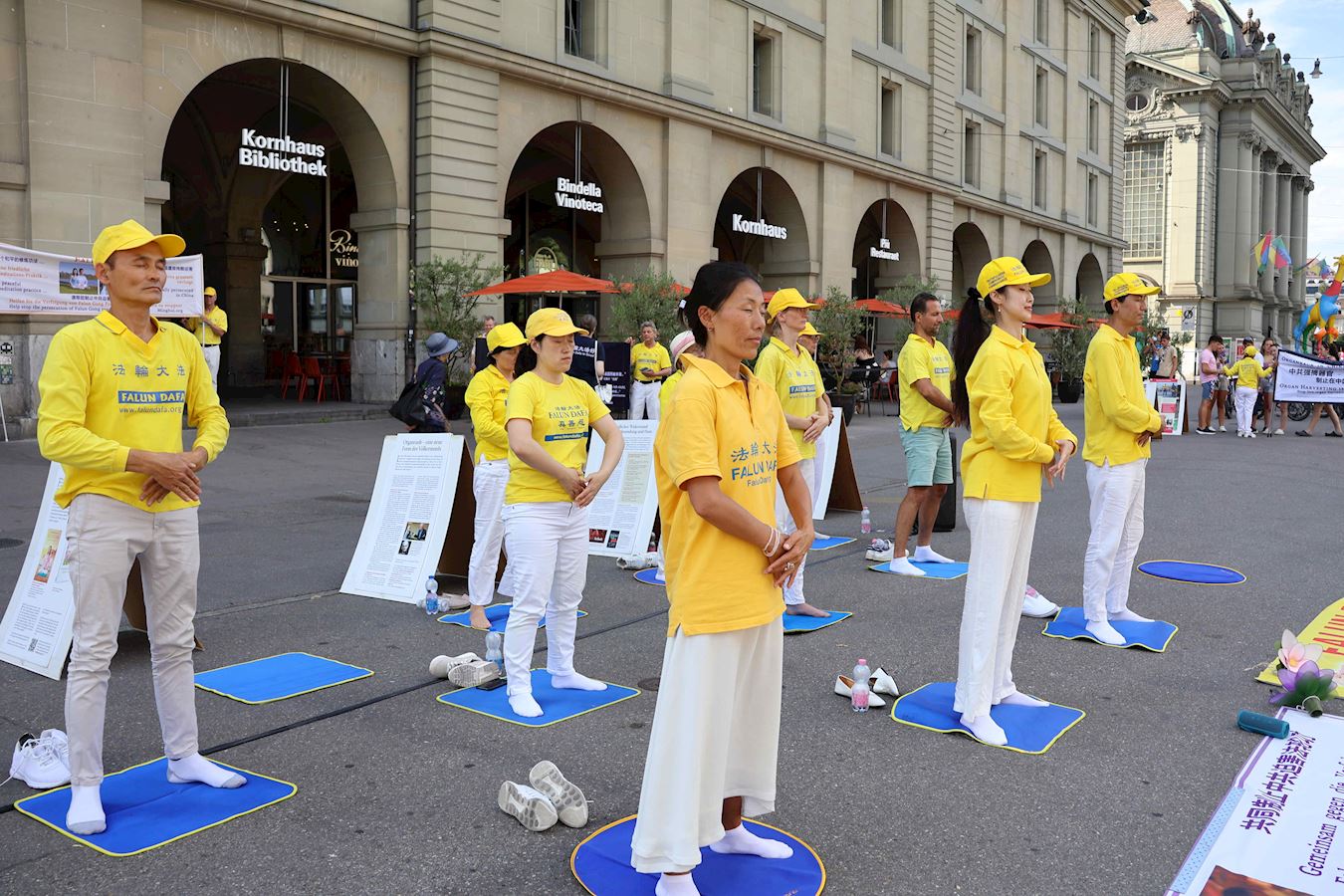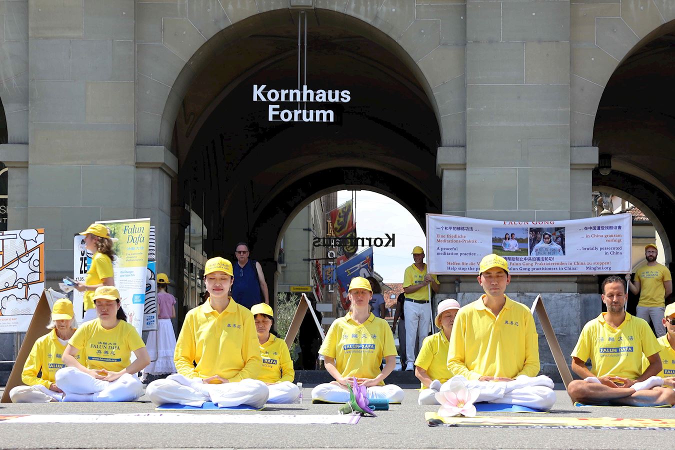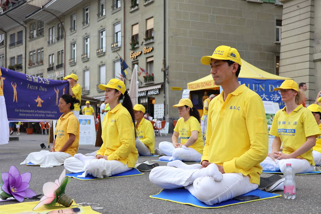 当天下午,丹尼尔和很多路人在原本空旷的广场上看到了不同的展板及横幅。一组身着明亮的黄T恤的男女老少随着优美的音乐做着平缓舒展的动作。当旁边演讲开始时,他们会盘腿打坐,安静祥和,如与周围的车水马龙隔离了一般。