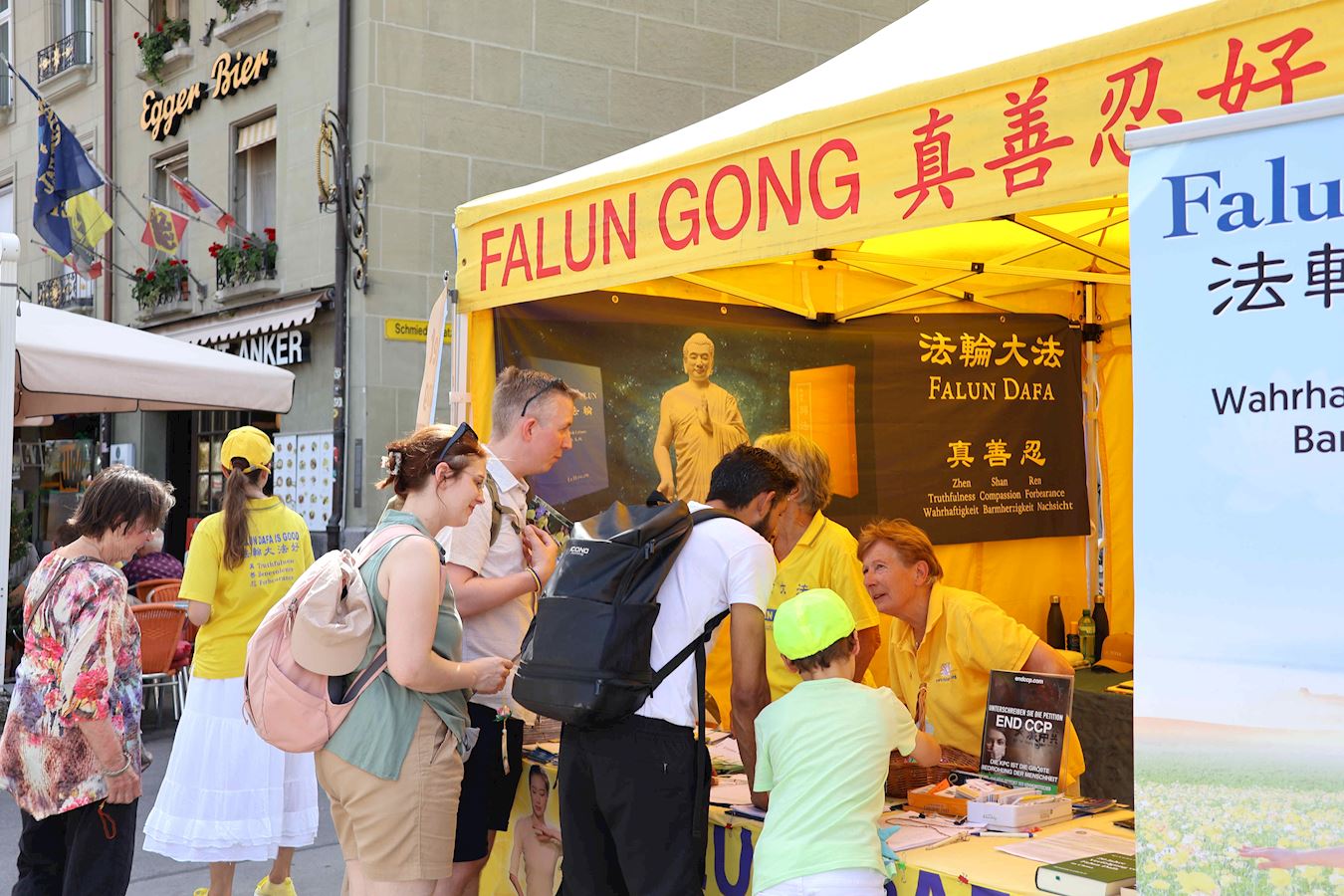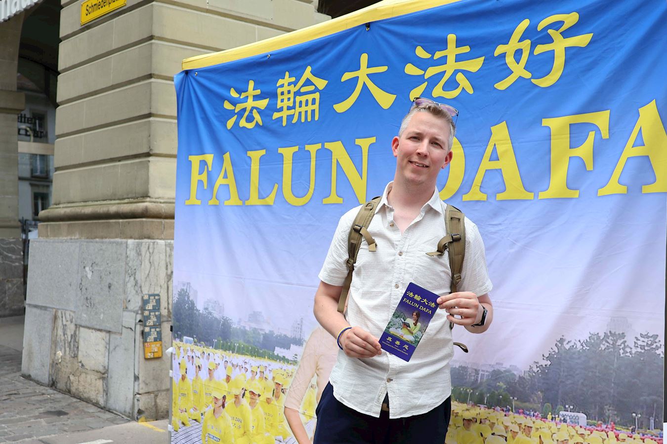 来自德国的亚历山大·劳滕施莱格(Alexander Lautenschläger)是位职业军人,正在伯尔尼度假的他看到法轮功学员的活动后格外高兴。在数年前,他曾在网上知晓了法轮大法:“我觉得这个信仰传递的讯息和引导的方向非常吸引人,是如此地祥和,美妙。我对法轮功有着非常正面的印象,其中特别提出了对人性及社会非常重要的点,非常正面,我很喜欢。”