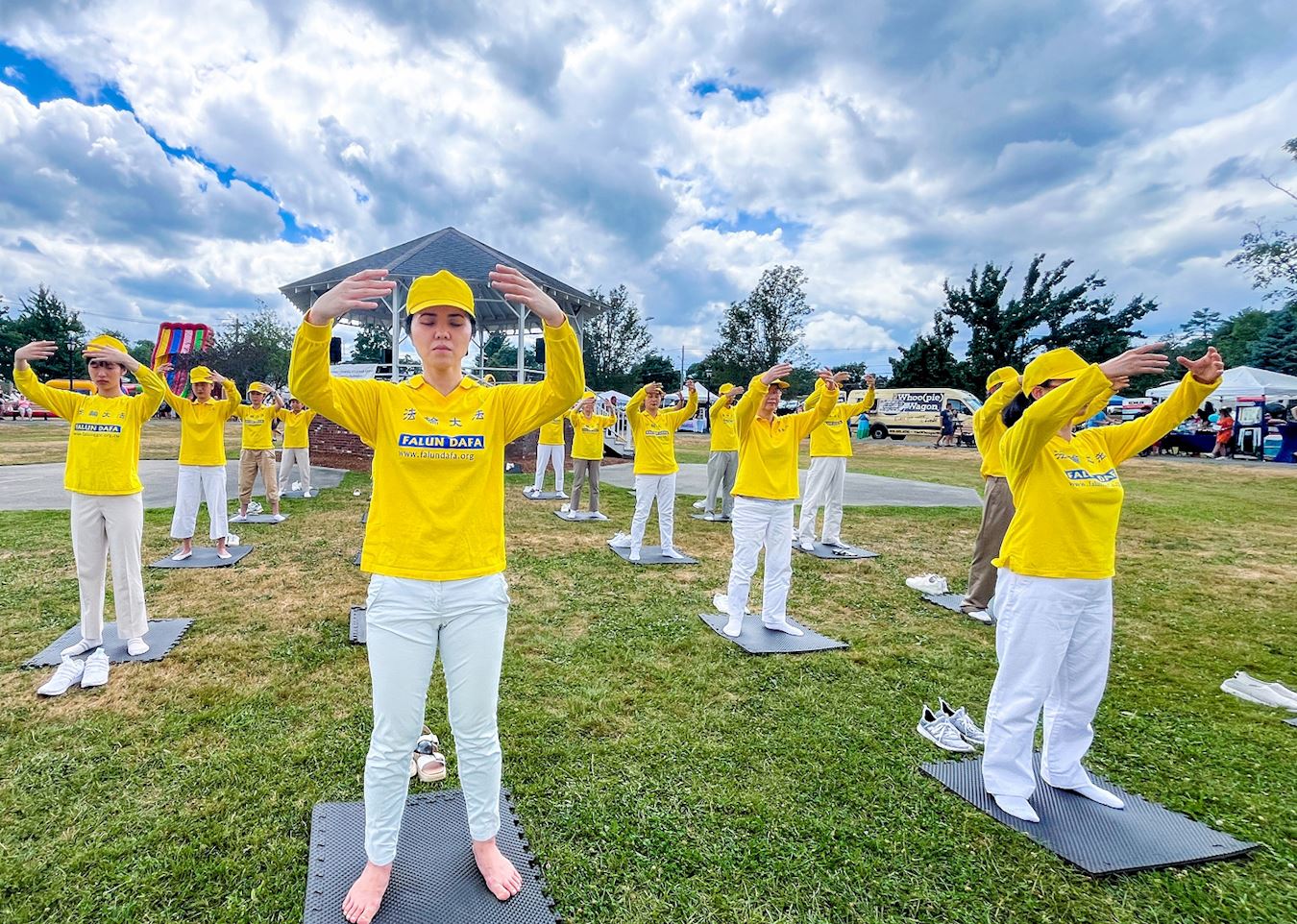 当天由于天气很热,学员们集体展示功法时,使用的坐垫很烫人,然而学员们发现,当功法展示一开始,天上飘来一片云,天气马上就凉爽下来了,等到功法展示结束,天才又热起来,学员们感到神奇。炼功现场殊胜祥和,吸引许多游客驻足观看,纷纷前来了解法轮大法。