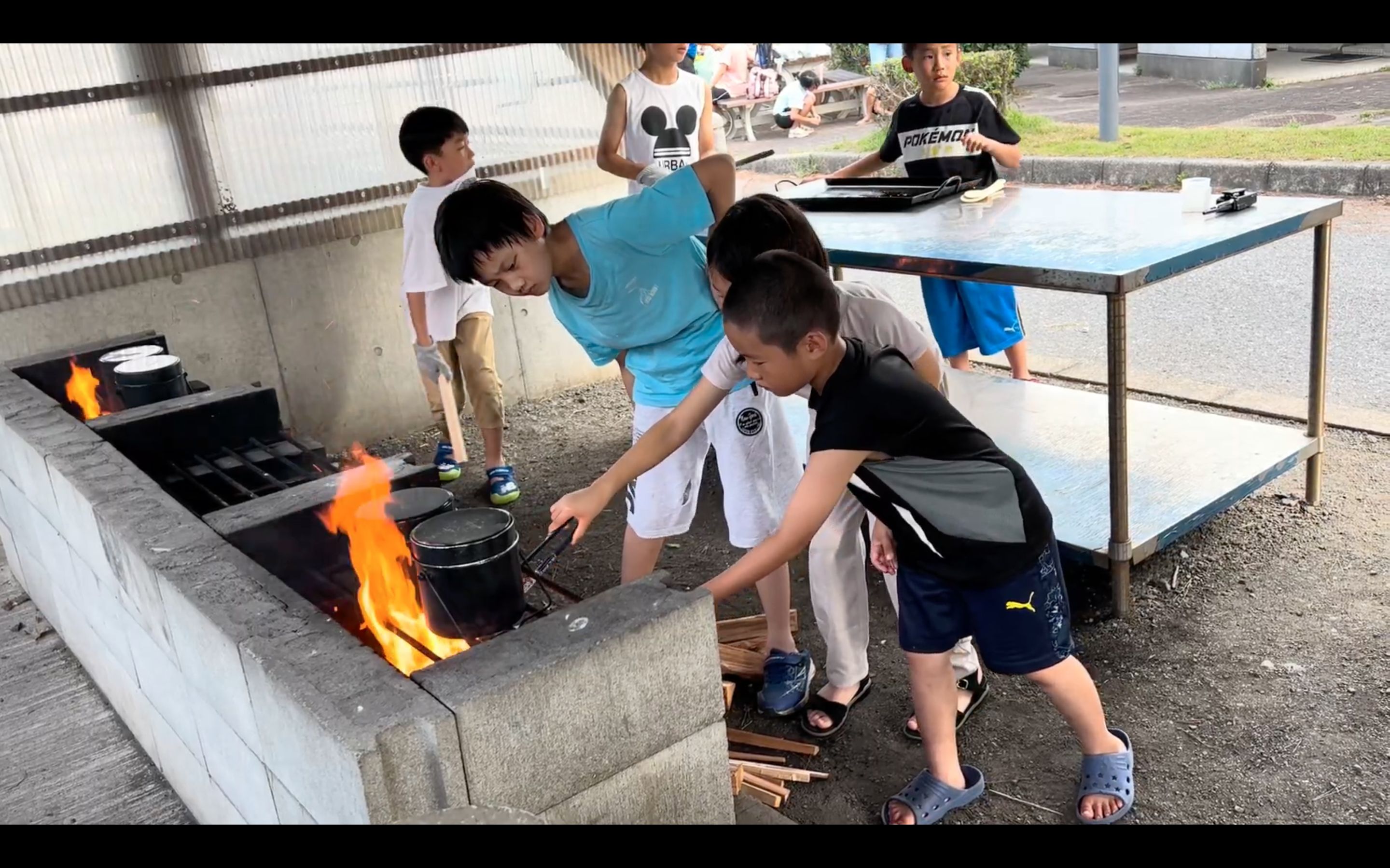 因为高年级的孩子们去年夏令营时已经有了一次野外生活做饭的经验,所以本次的劈柴生火,基本都是孩子们自己完成,女孩子们负责切菜煮饭,男孩子们主要负责劈柴生火添火。在指导员和妈妈们的协助下,很快咖喱饭就做好了,大家吃得津津有味。