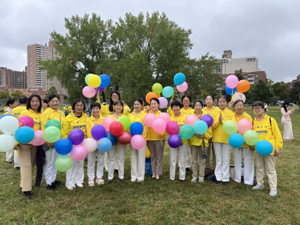 绿草茵茵的公园里,来自纽约各地的法轮功学员,男女老少,手持气球、彩旗和横幅,排着整齐的队伍,怀着喜悦和感恩的心情,双手合十,齐诵:“恭祝师尊中秋快乐!法轮大法好!真善忍好!”