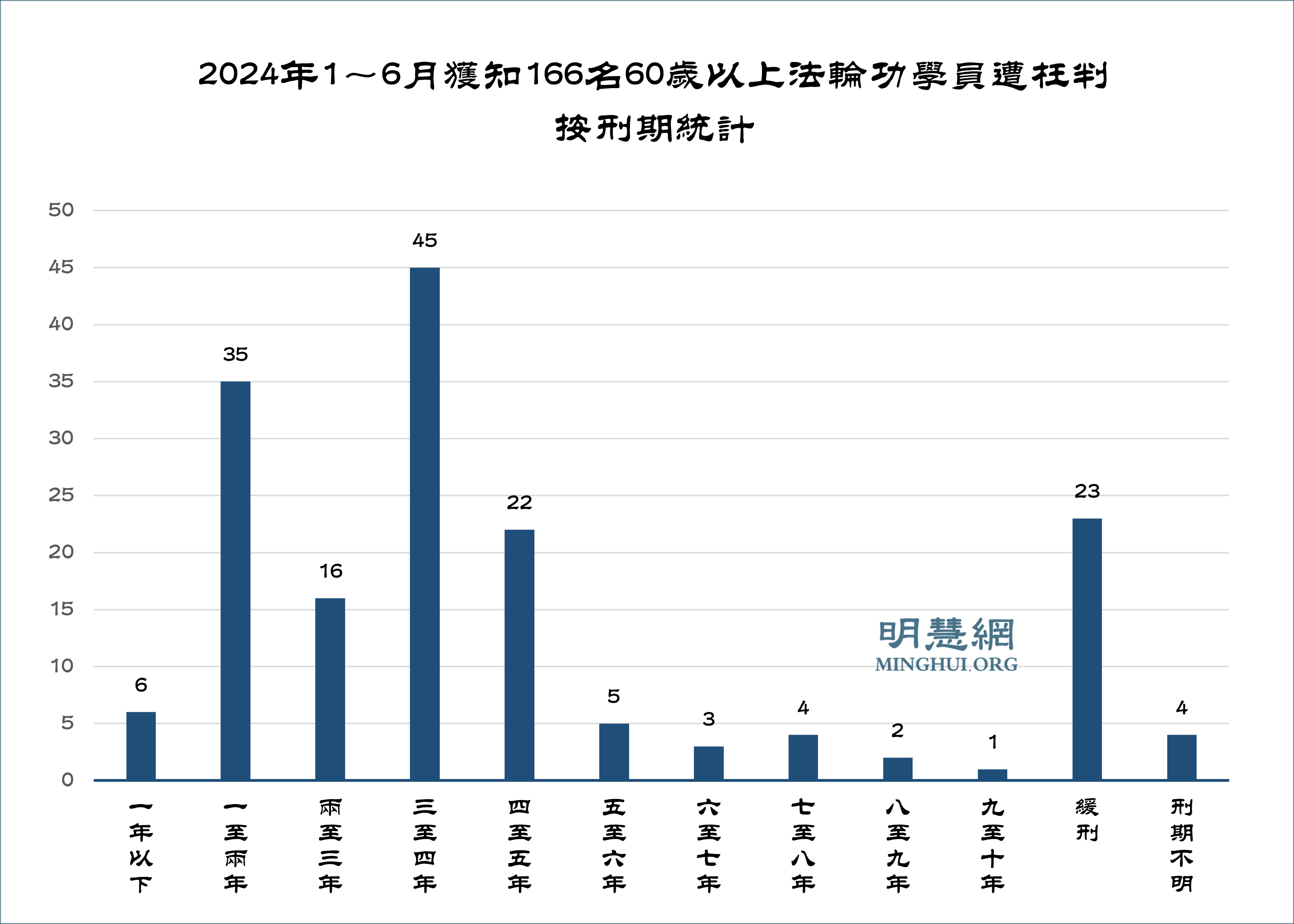 图2:2024年1~6月获知166名60岁以上法轮功学员遭枉判按刑期统计