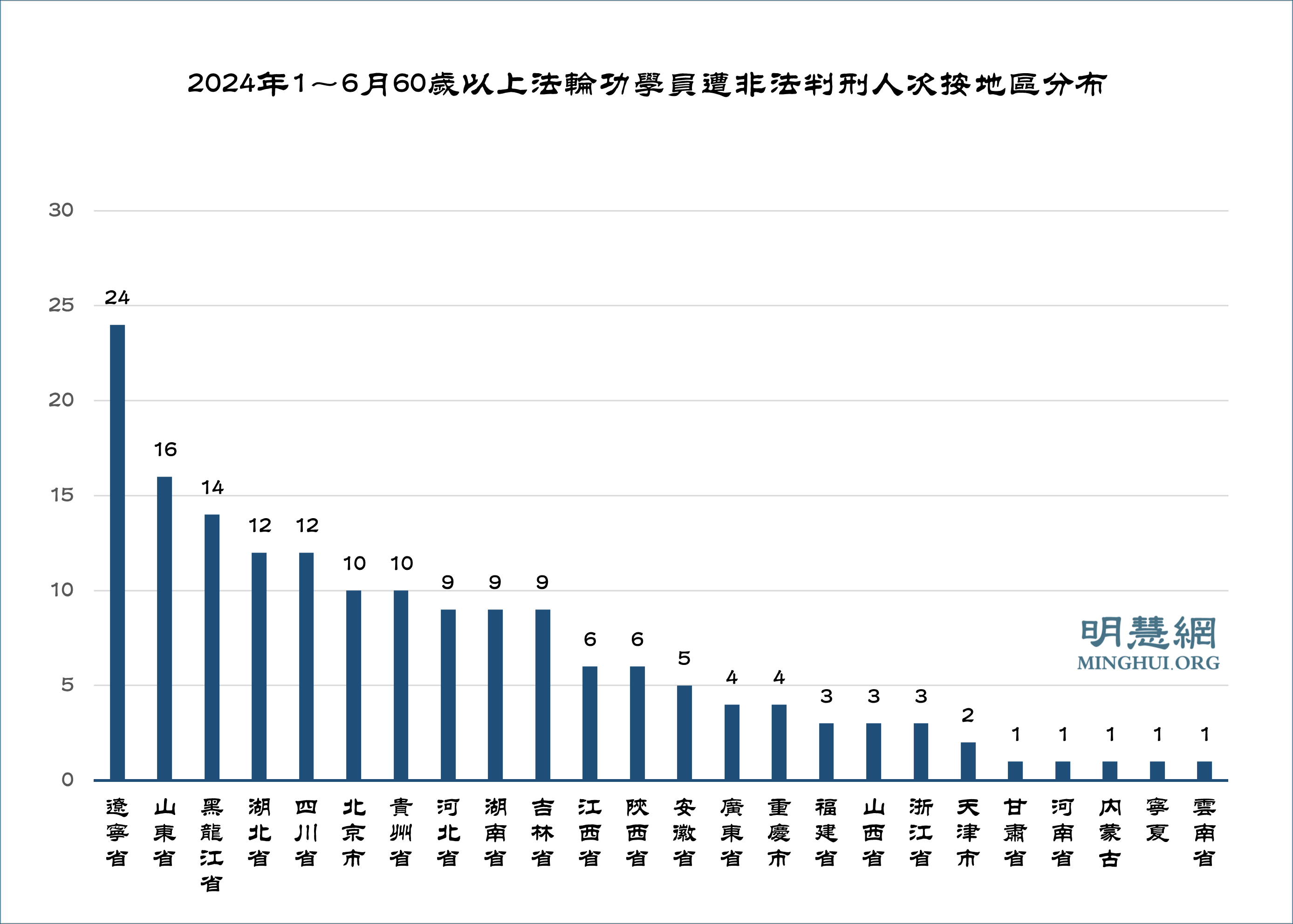 据明慧网报道统计,今年上半年至少有166名60岁以上老年法轮功学员被枉判。迫害严重地区依次为:辽宁省24人,山东省16人,黑龙江省14人,湖北省、四川省12人,北京市、贵州省10人,河北省、湖南省、吉林省9人。