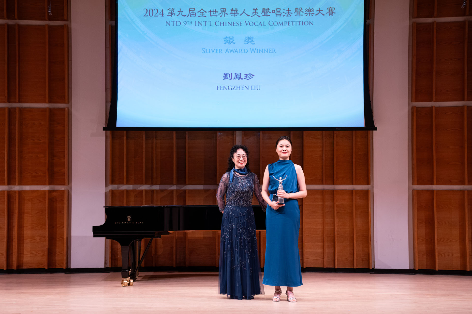 ![]() 图3:在新唐人第九届全世界华人美声声乐大赛颁奖仪式上,歌唱家姜敏(左)向银奖得主刘凤珍颁奖后合影。 |