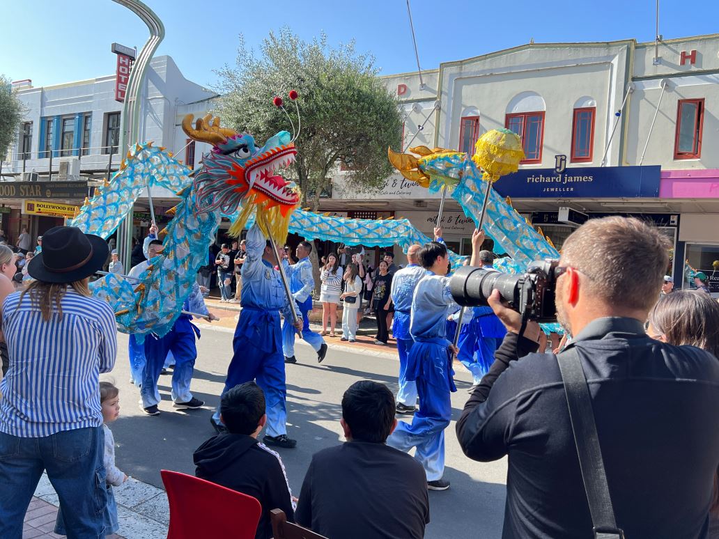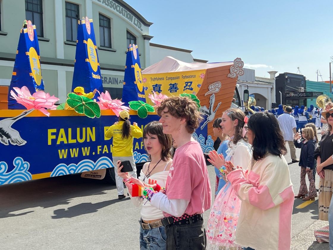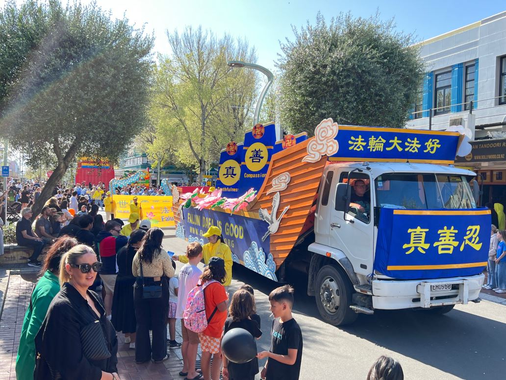下午一点,游行正式开始。黑斯廷斯的主要商业街已经挤满了人,上万人都在翘首期盼。由法轮功学员组成的天国乐团身着蓝白相间的传统服饰,雄壮的乐曲让人们耳目一新;舞龙队灵动的表演让人目不暇接,赢得人群的阵阵喝彩;花车上中英文印着的“真、善、忍”是他们最愿意分享给社区的理念。