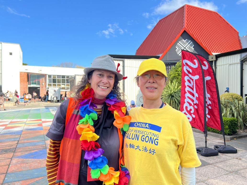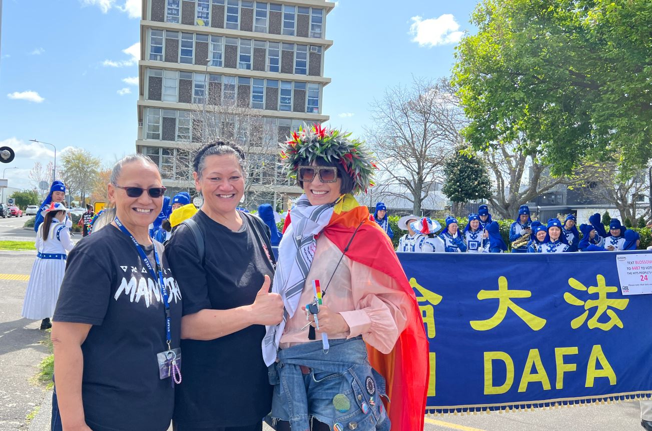 她们说:“法轮功学员的花车周围点缀着黄色气球,非常漂亮。我们也喜欢(天国)乐团的演奏。队伍组织有序,整体很和谐。” 花车的设计还让她们想起了新西兰毛利族裔的战船。