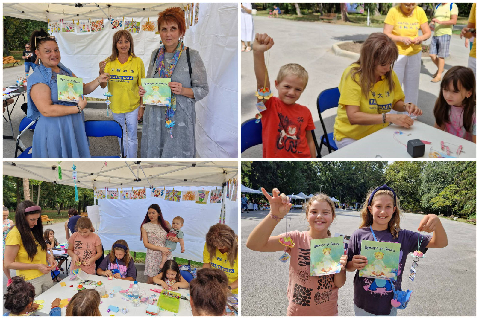 法轮功学员的展位吸引了不少观众,学员们还向孩子们推荐并赠送了儿童读物——《莲花的故事》,这本书由法轮功学员创作,旨在教导儿童在生活中要真诚、善良,有耐心,通过遵循真、善、忍,孩子们可以克服困难,从而成为更好的人。