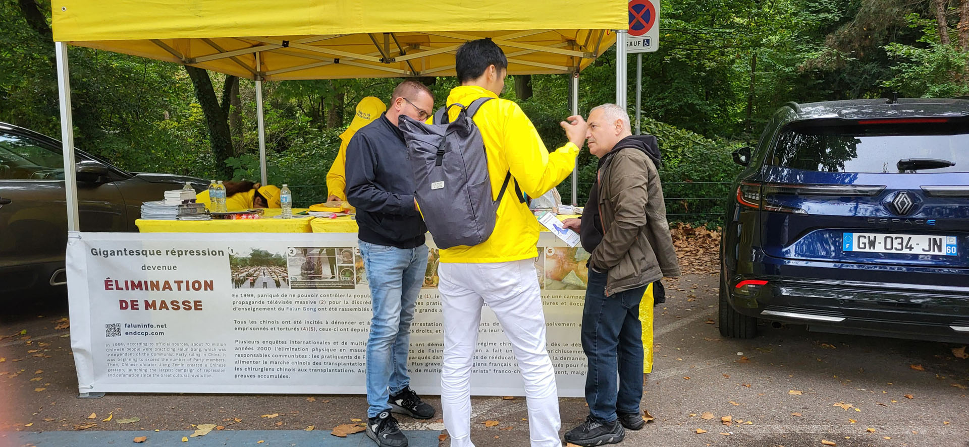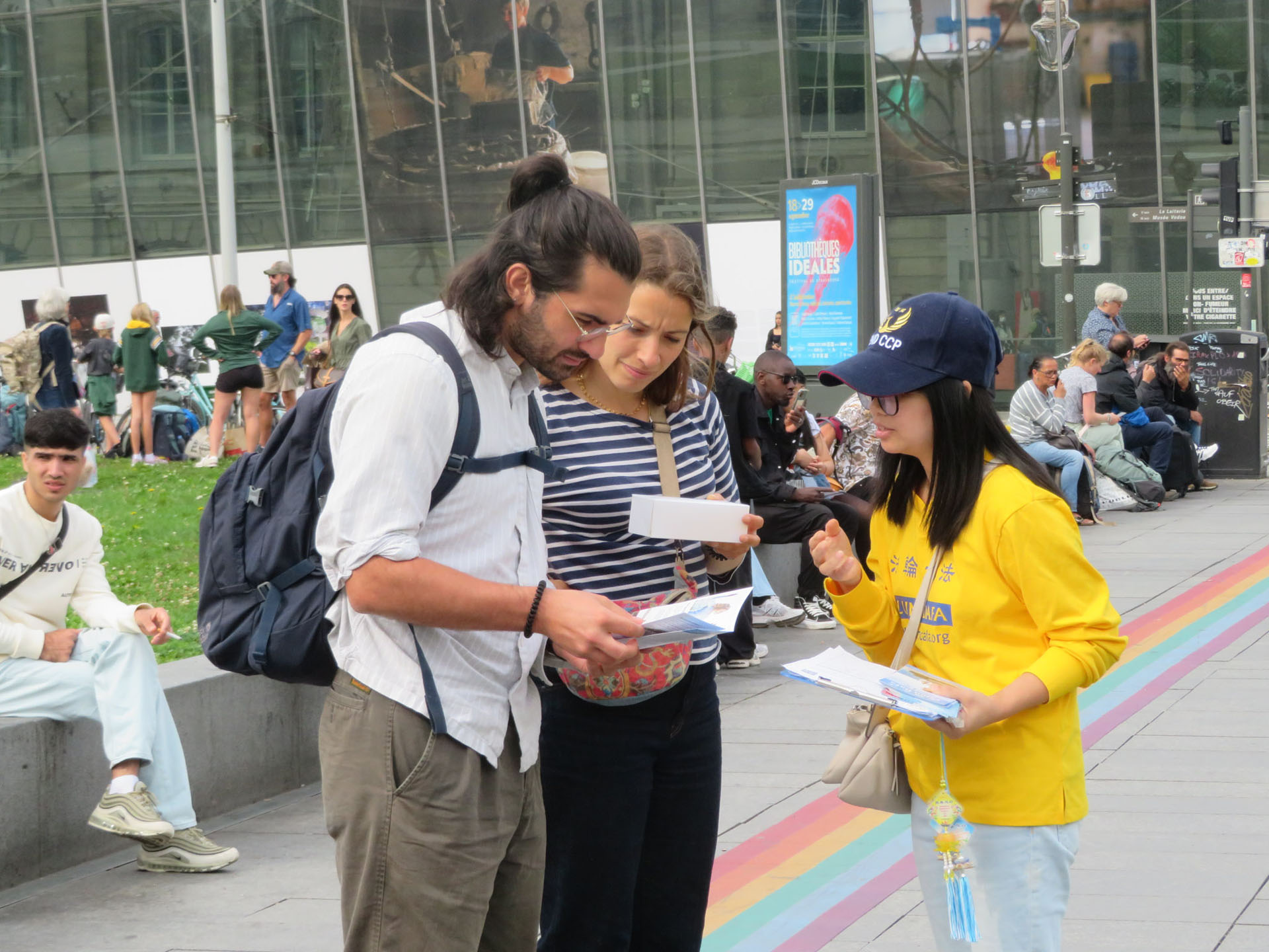 埃蒂安-彼得拉诺(Étienne Peterano)被法轮功的活动吸引。他在火车站广场待了很久,不想离开。这是他第一次听说法轮功和中共迫害法轮功这件事,很受触动。埃蒂安希望中国人有言论自由,美洲、欧洲强国应该向中国政府施加压力。(中共对法轮功的)迫害二十多年了,还在继续,他认为这不正常。
