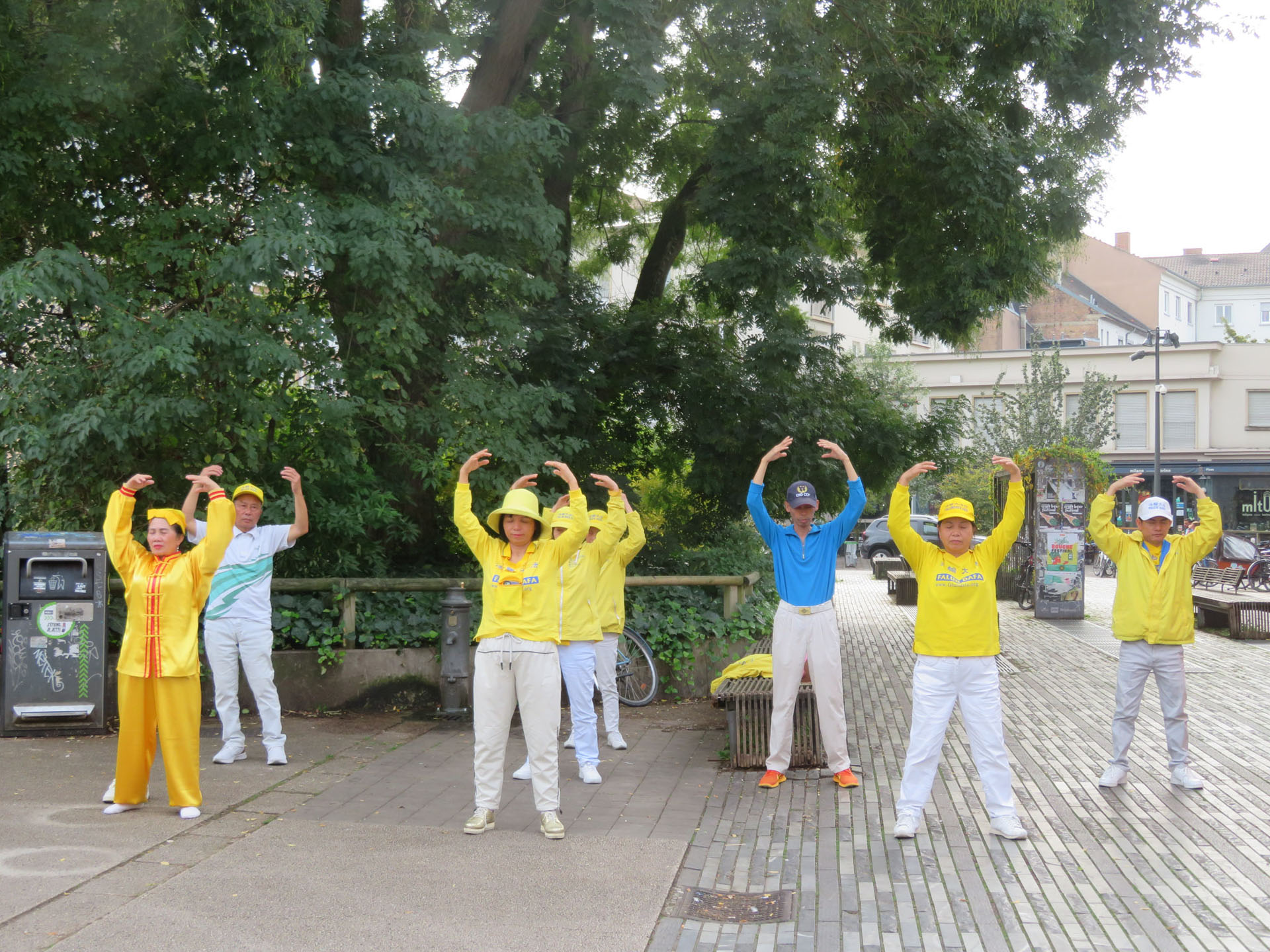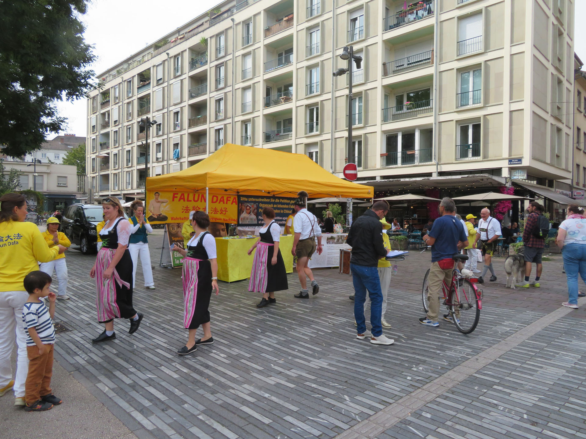 图6~9:九月二十二日,法轮功学员在法国斯特拉斯堡火车站广场进行了法轮功功法演示、讲真相和反迫害征签活动,活动吸引了很多民众和游客。